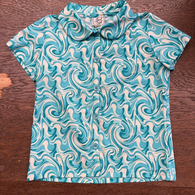 jewel trashトップス ブルーマーブル USコットン生地で仕立てた1点ものトップスです サイケで昭和で爽やか! サブリナパンツ、台形スカート、サンダル、麦わら帽子と合わせたくなるアイテムです。 ボタンはビンテージボタン採用です 平置きサイズ 着丈 53センチ 肩幅 35センチ バスト 45センチ 袖 15センチ