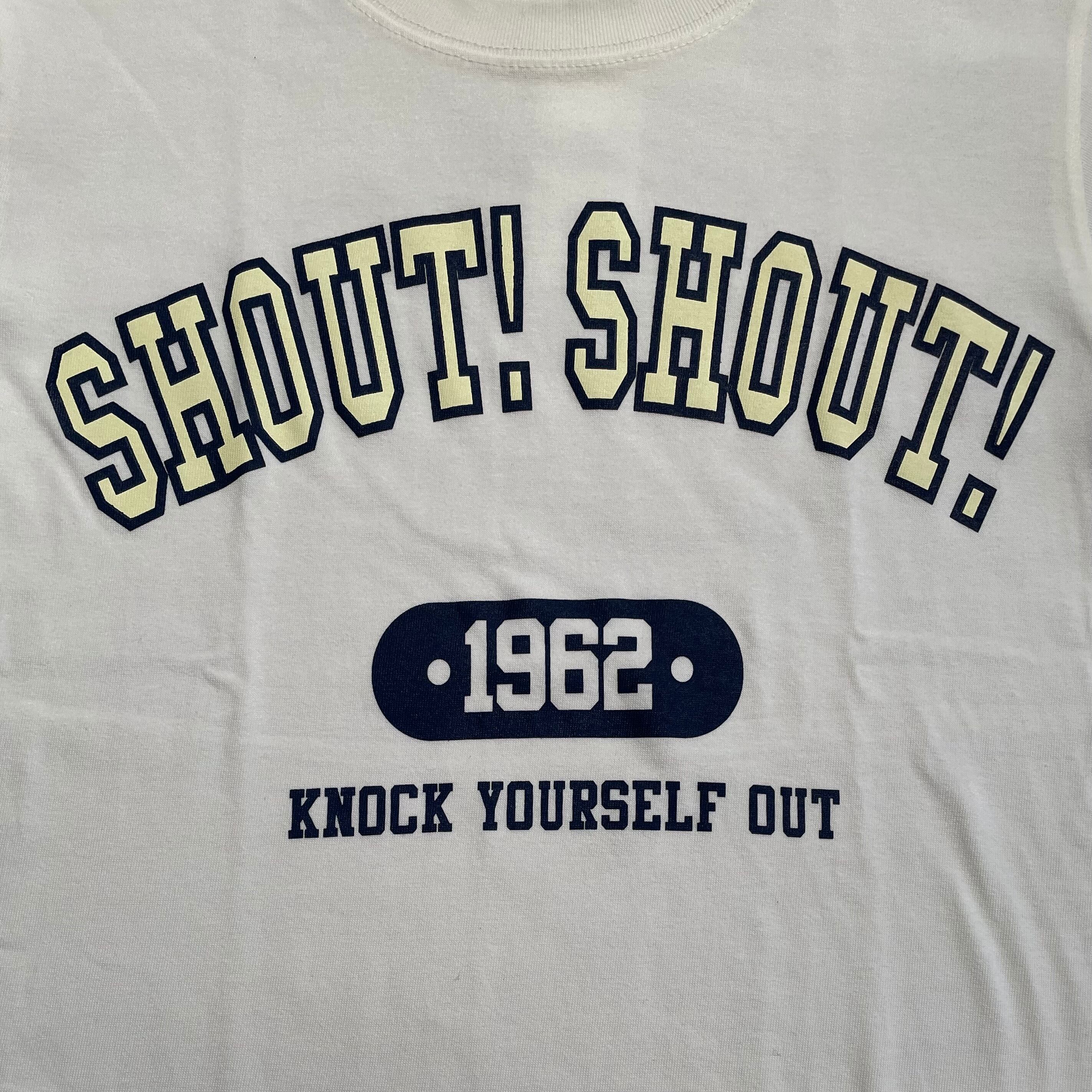 往年のクラブヒット曲「SHOUT! SHOUT!(KNOCK YOURSELF OUT)」の曲名をカレッジ風にデザイン。