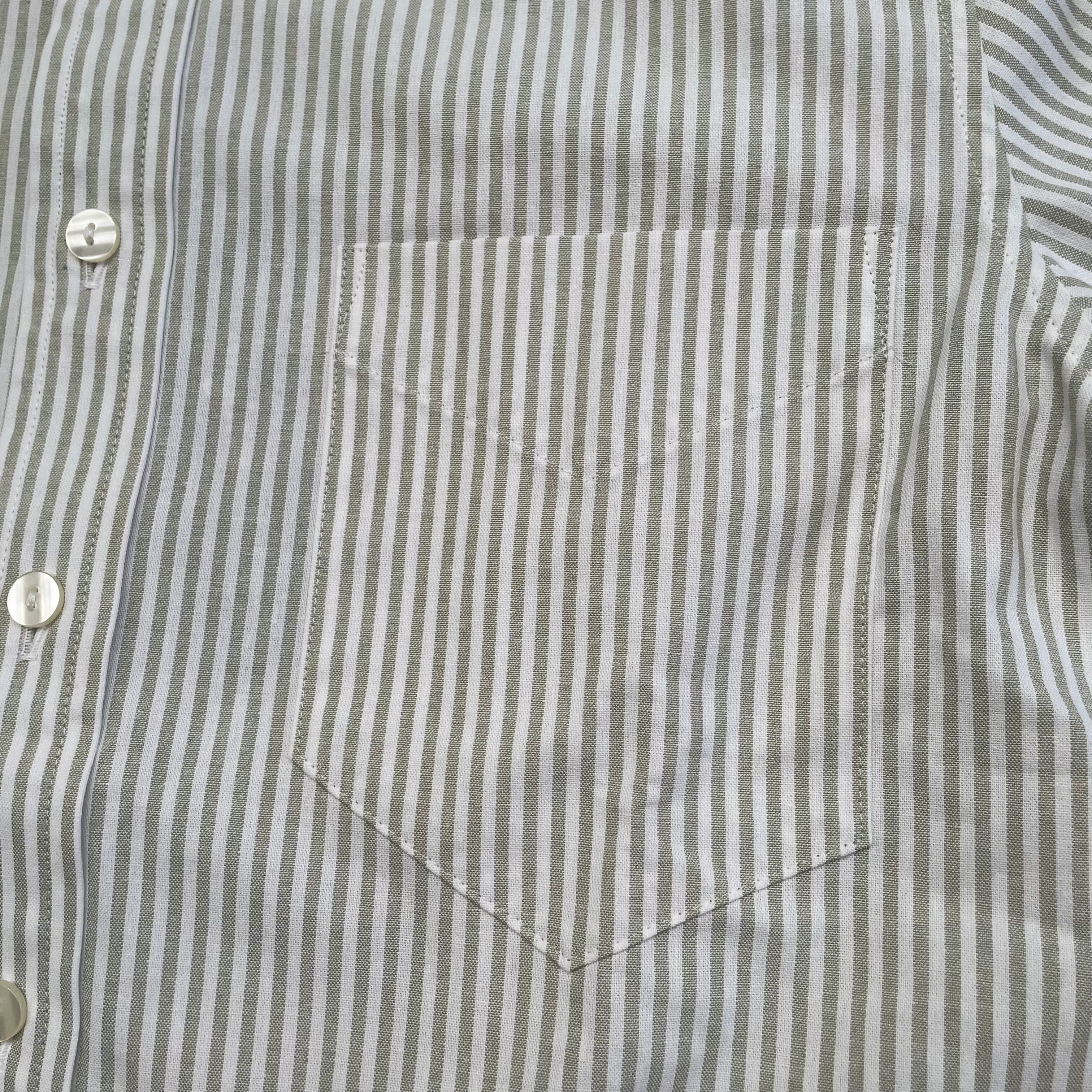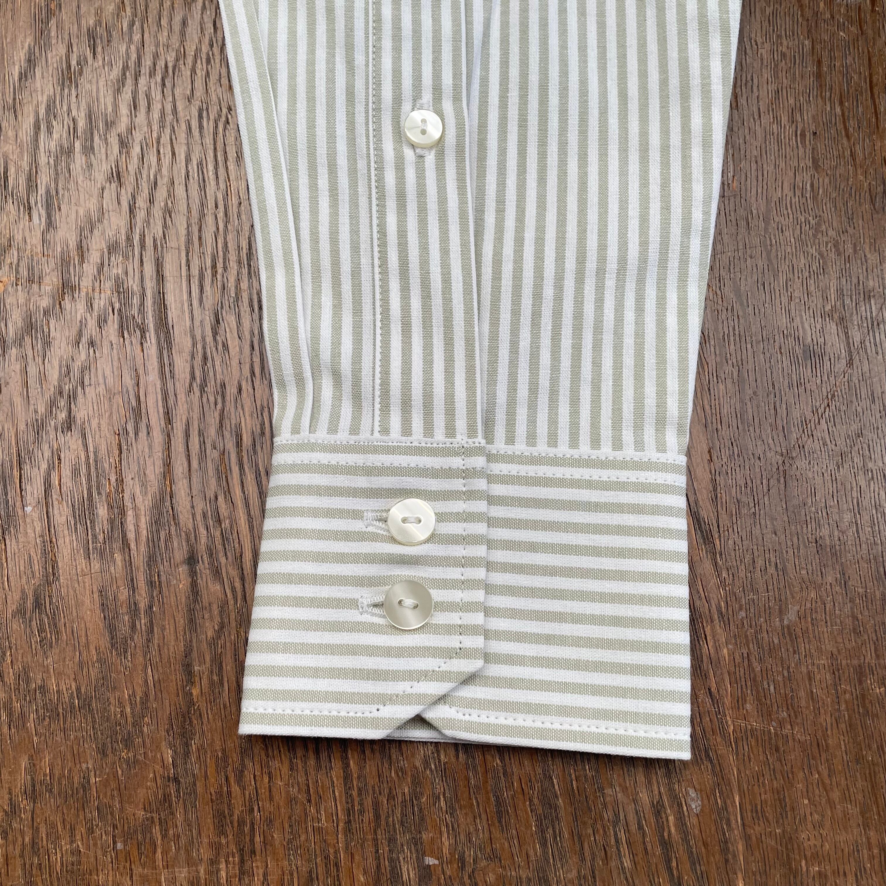 3フィンガーでバックボタンの付いた襟、極端に狭いヨーク、フルボックスプリーツ、背面のダーツ、ハンガーループ、深さのある袖口のケンボロ、ダブルボタンのカッタウェイカフス、裾のボックスシルエット、染めた2つ穴フラットボタン。