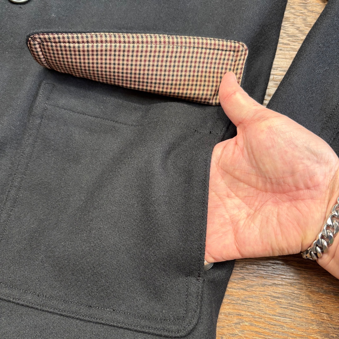 【地は肌触りの良いトラッドなポリエステル・ガンクラブチェック(中綿入り)。袖裏も中綿入りのキルティング仕様なので腕までしっかり防寒。真冬の冷たい目にも負けず、全身を暖かく包み込んでくれます。ジャケットや厚手のものを着ていても織りやすいゆとりのあるニューサイズ。イギリスのワークウェアのシキージャケットを、タウンユースの最適なデザインに昇華させました。