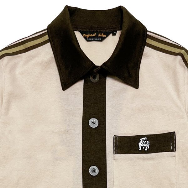 サイドにスポーティなラインテープ装飾、胸に"ブルドッグ"刺繍入りの切替ポケット、袖口カフス、ウェストベルト