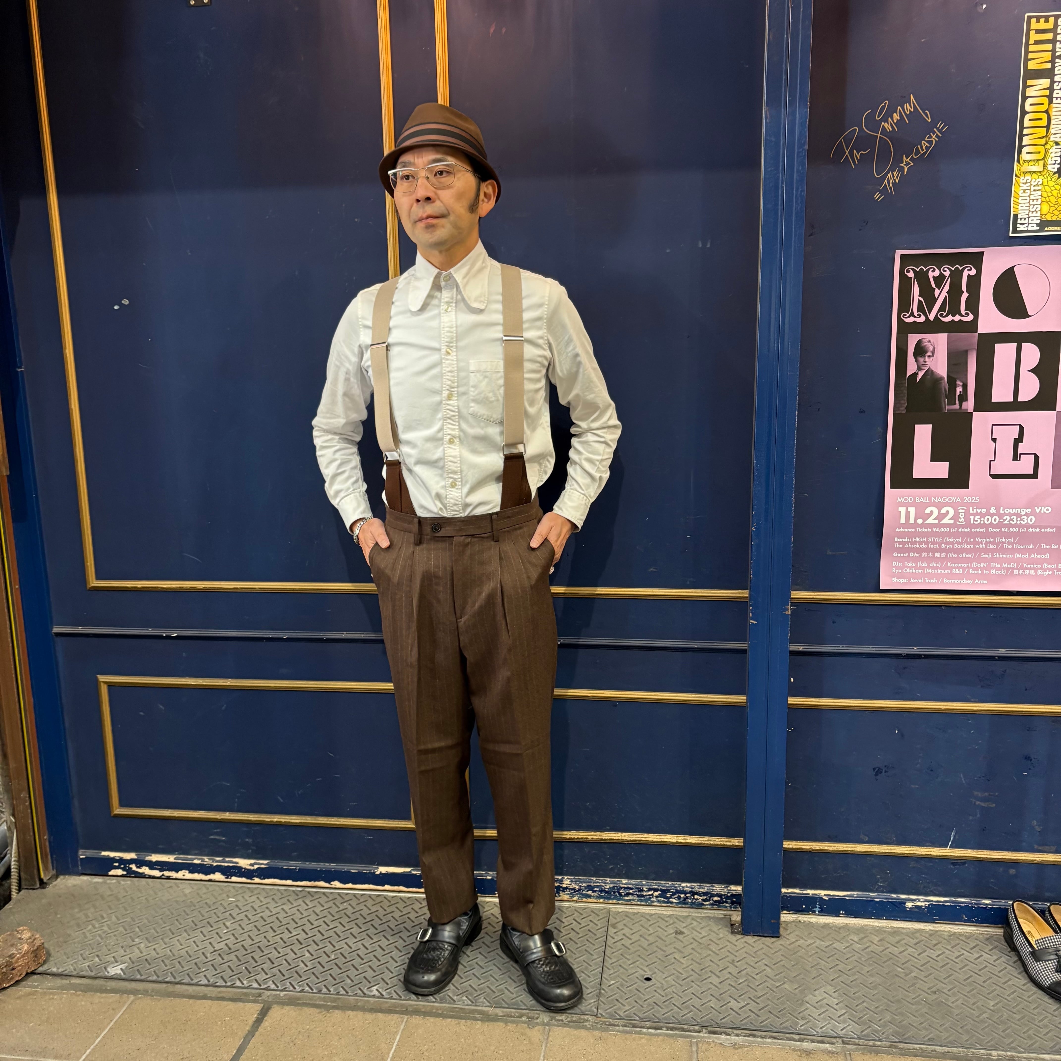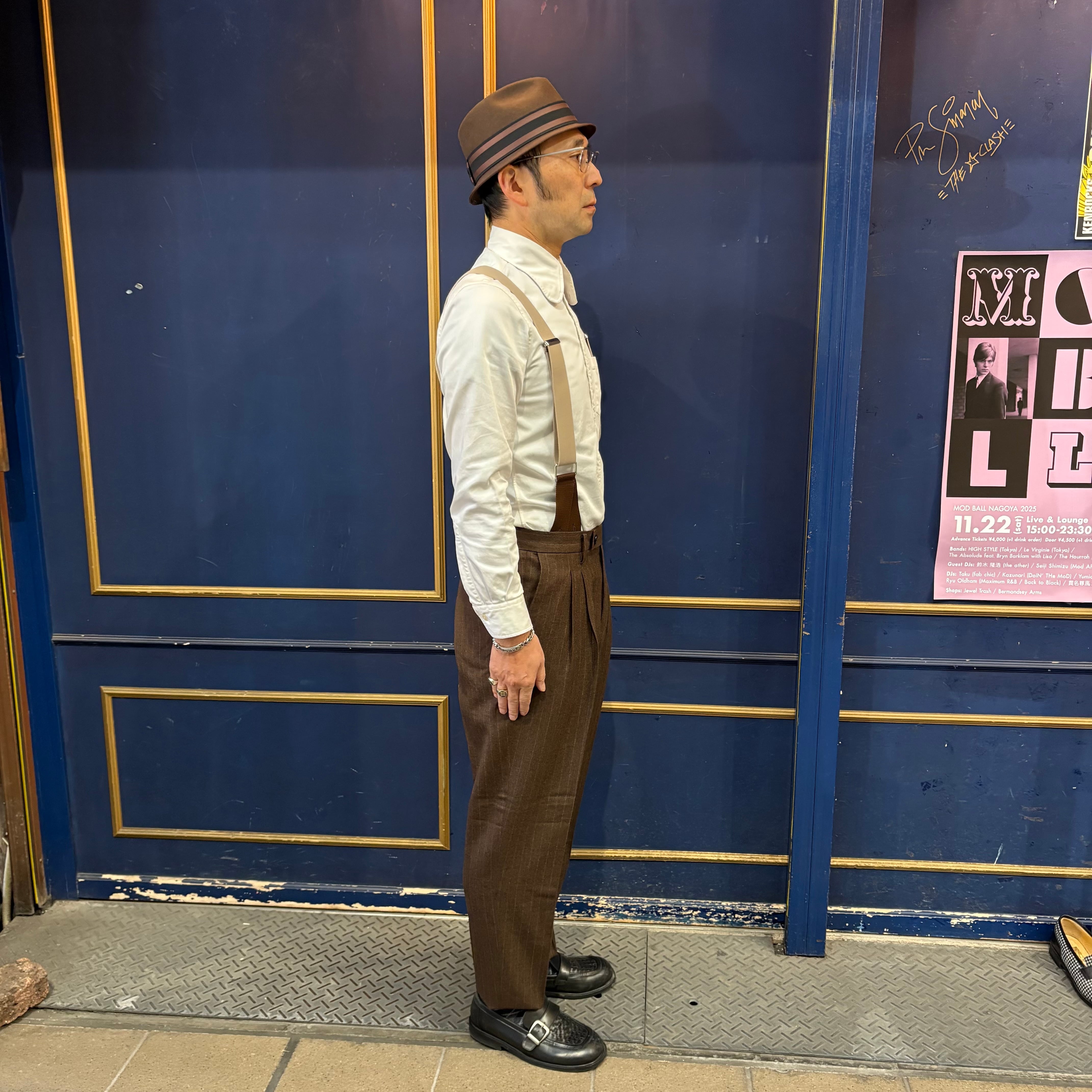 2タックが入った太いワタリから強めの角度でテーパードしていくシルエットで、短靴との相性が非常に良いです。