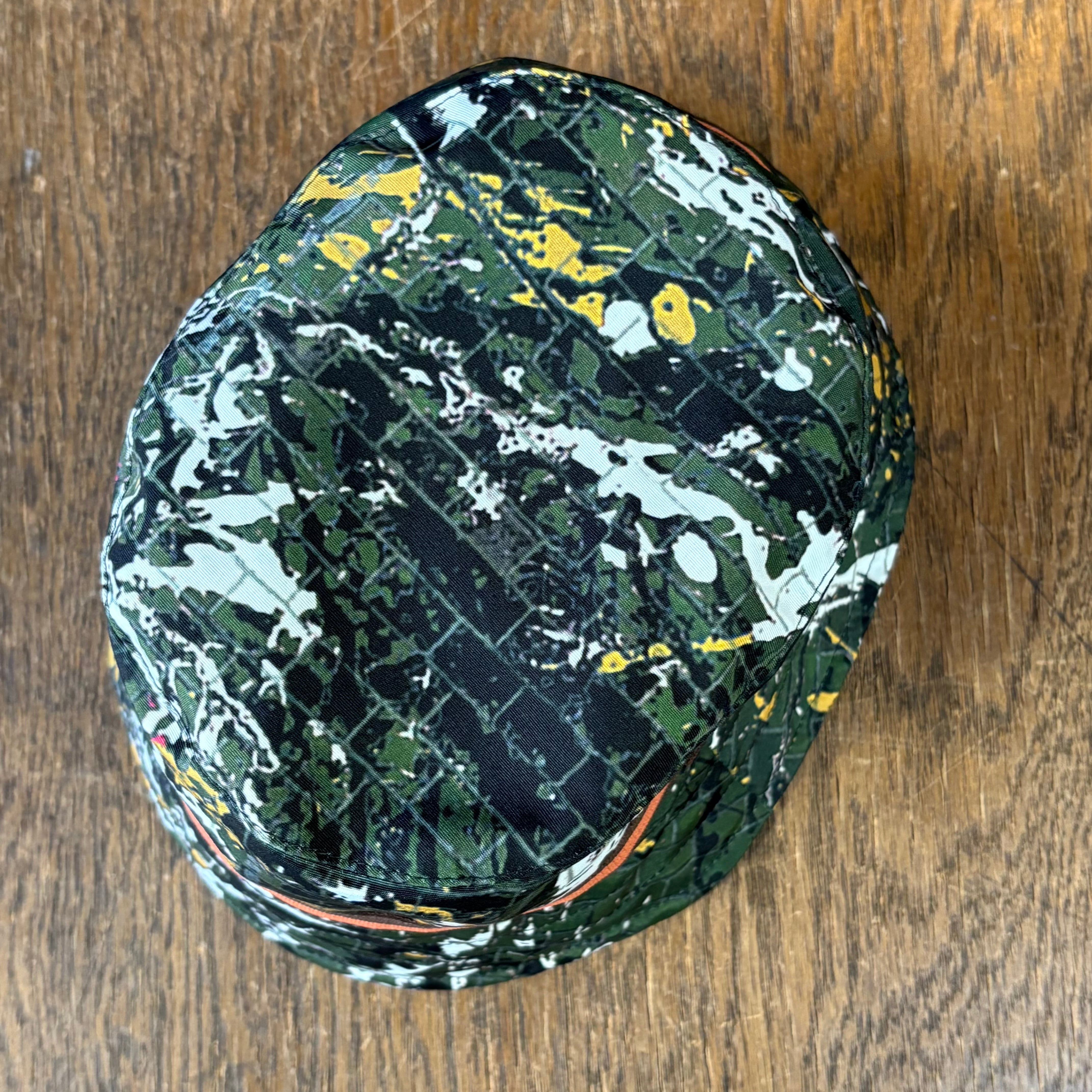 リバーシブル仕様で、片面はオリジナルの"DRIP PAINTING ON THE BRICK WALL"柄にストライプテープ、 そしてもう片面には無地の生地にロゴプレート