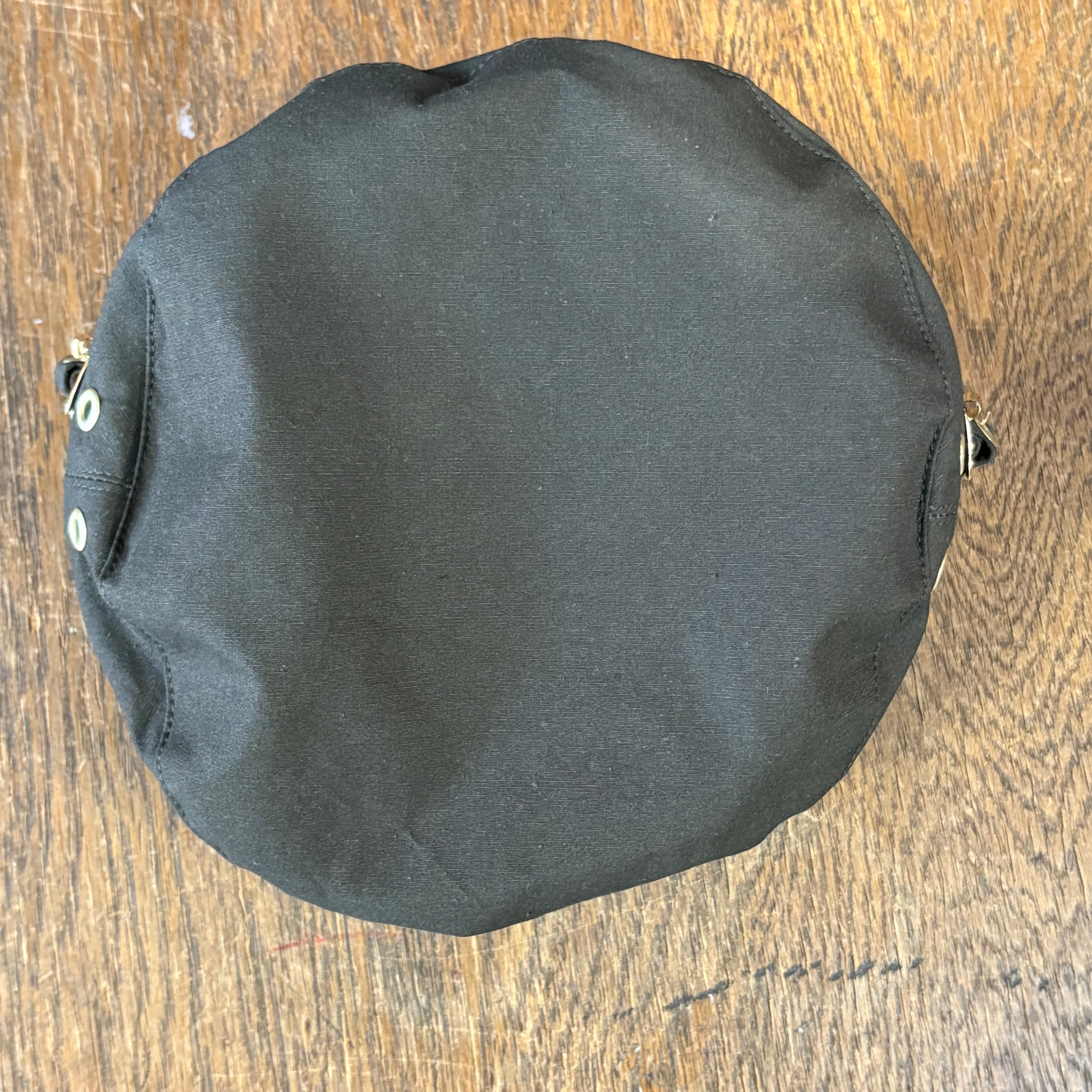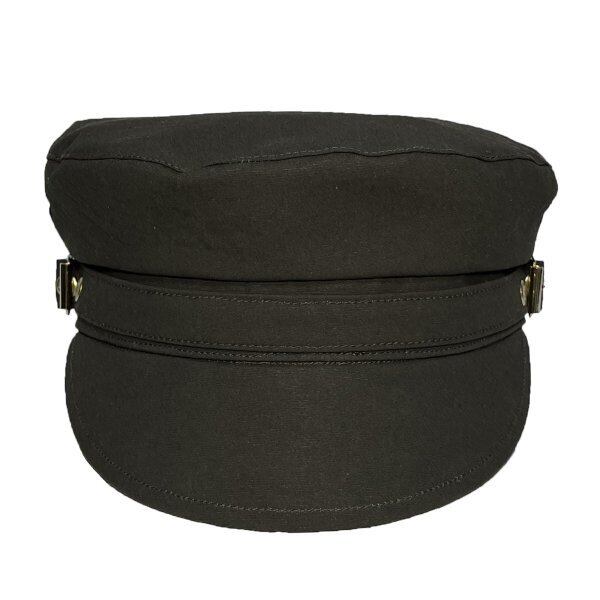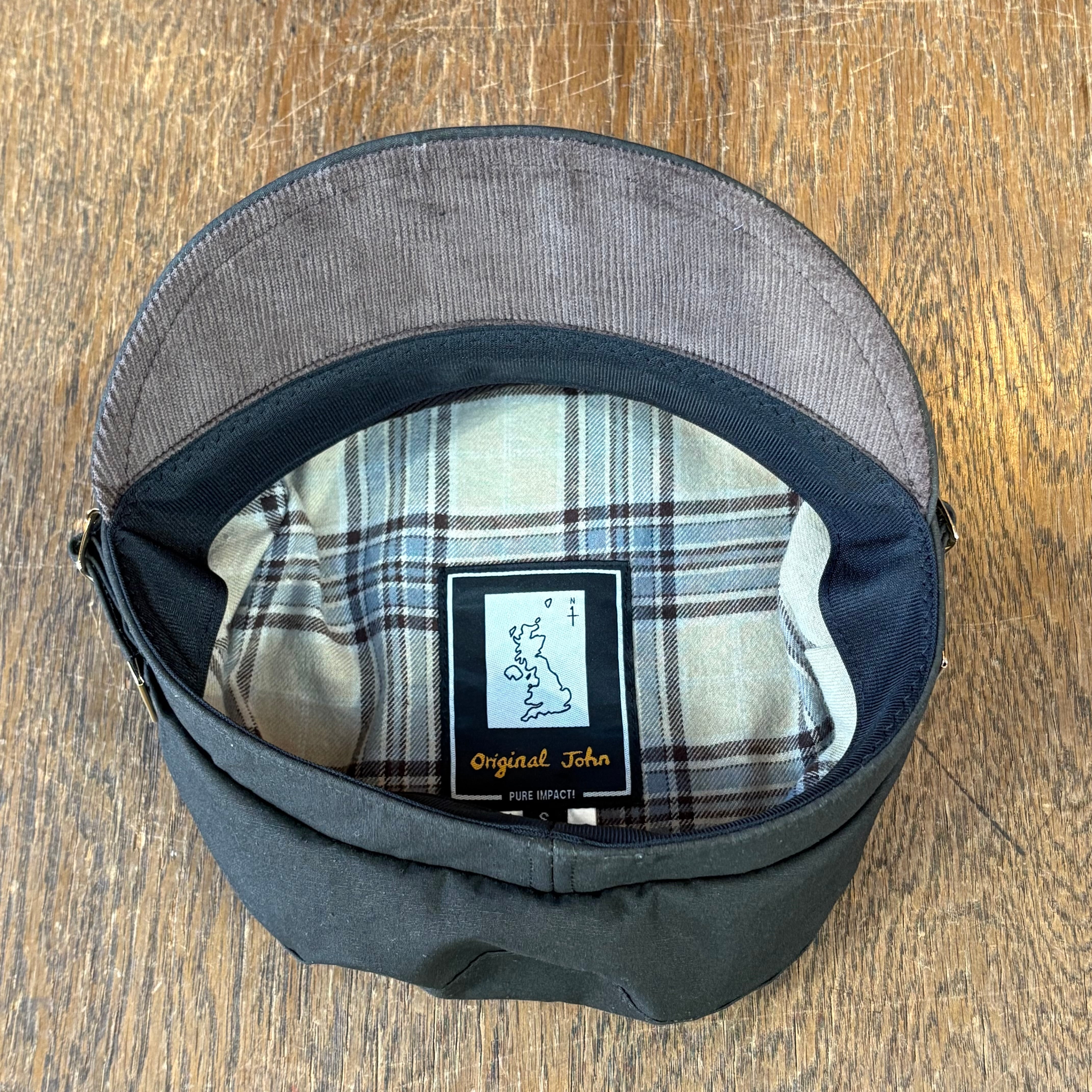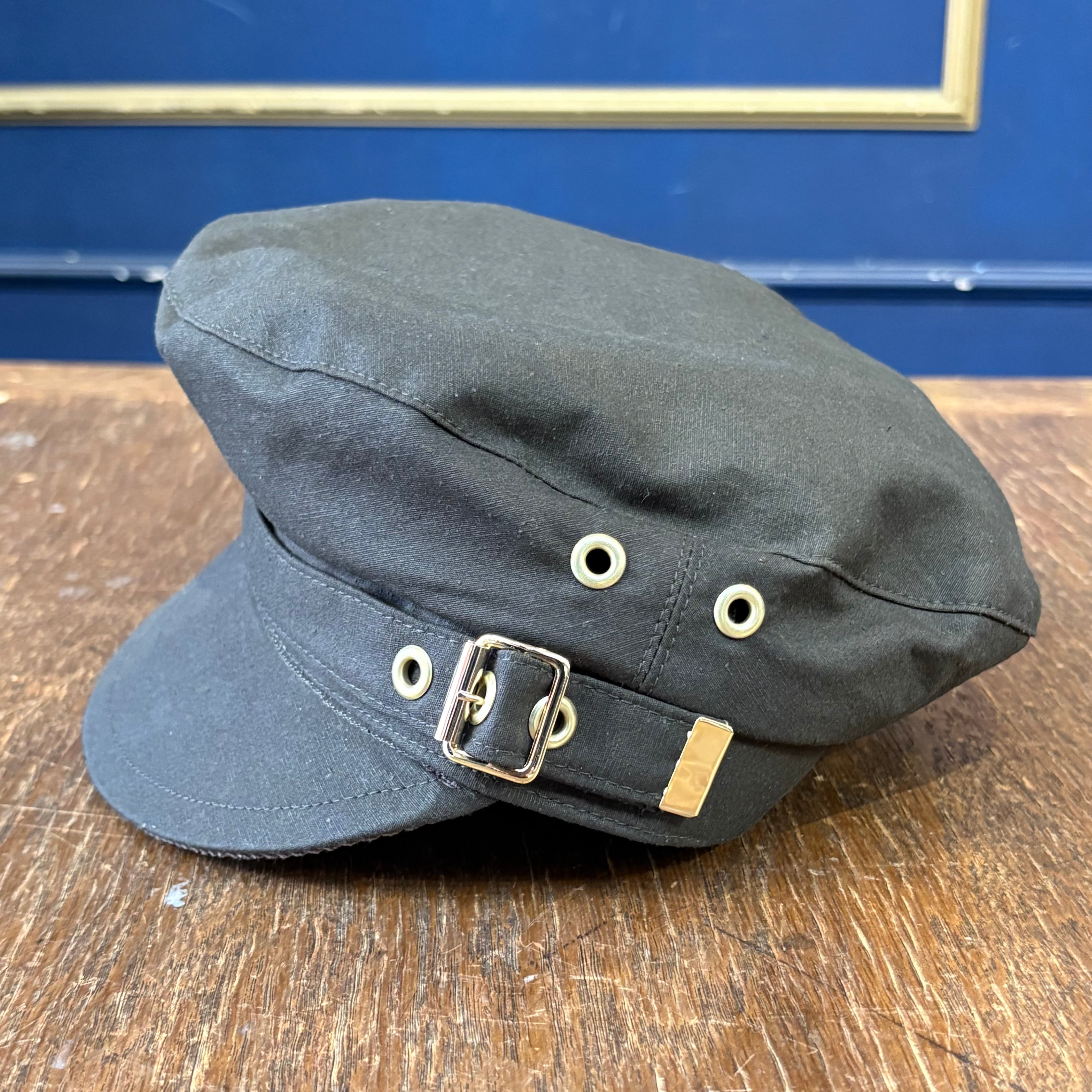 額当てのハトメや剣先パーツ、バックルベルトのデザイン、ツバ裏にはコーデュロイ、 裏地には着古されたワックスジャケットの裏地をイメージして後染めしたタータンネル素材