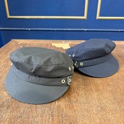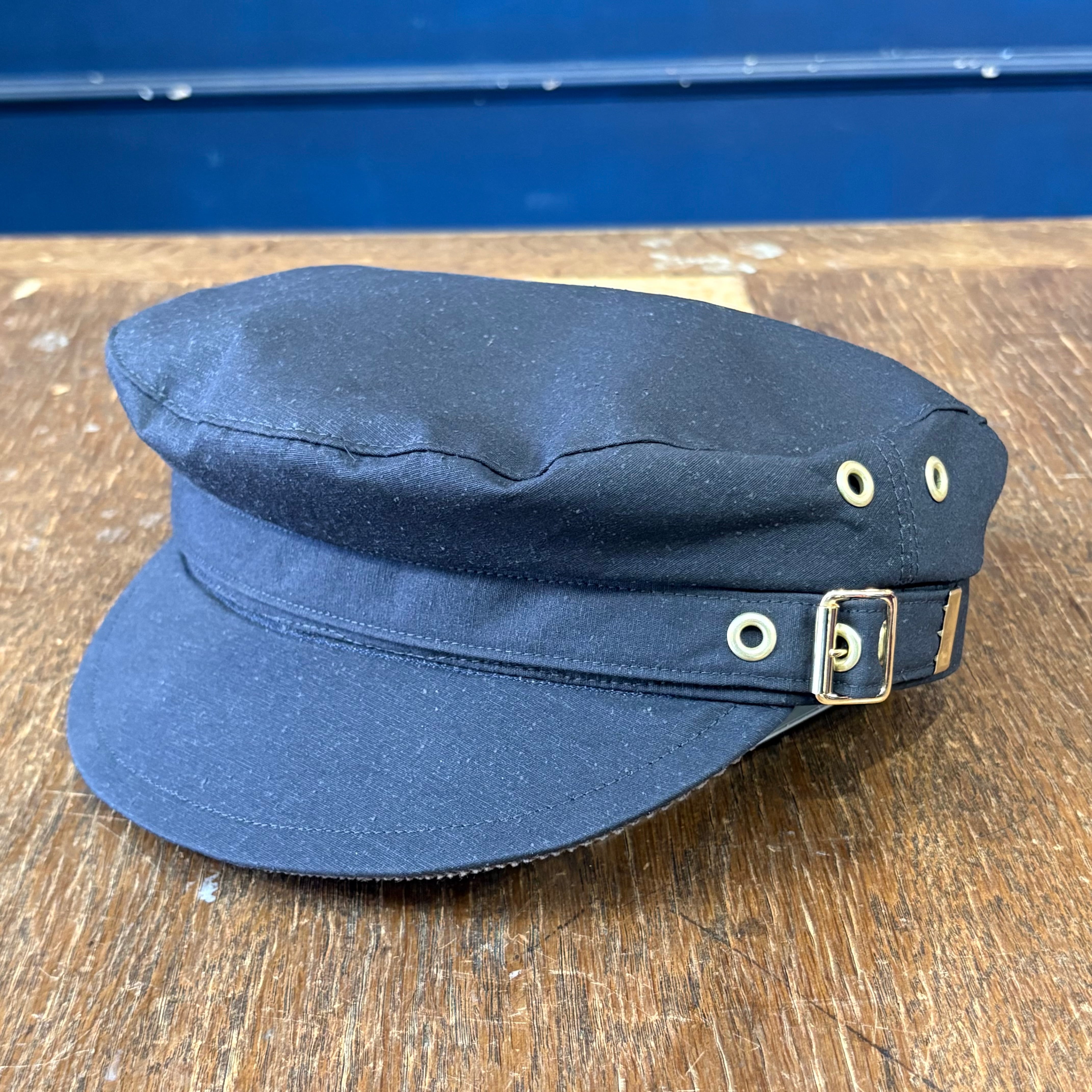 額当てのハトメや剣先パーツ、バックルベルトのデザイン、ツバ裏にはコーデュロイ、 裏地には着古されたワックスジャケットの裏地をイメージして後染めしたタータンネル素材