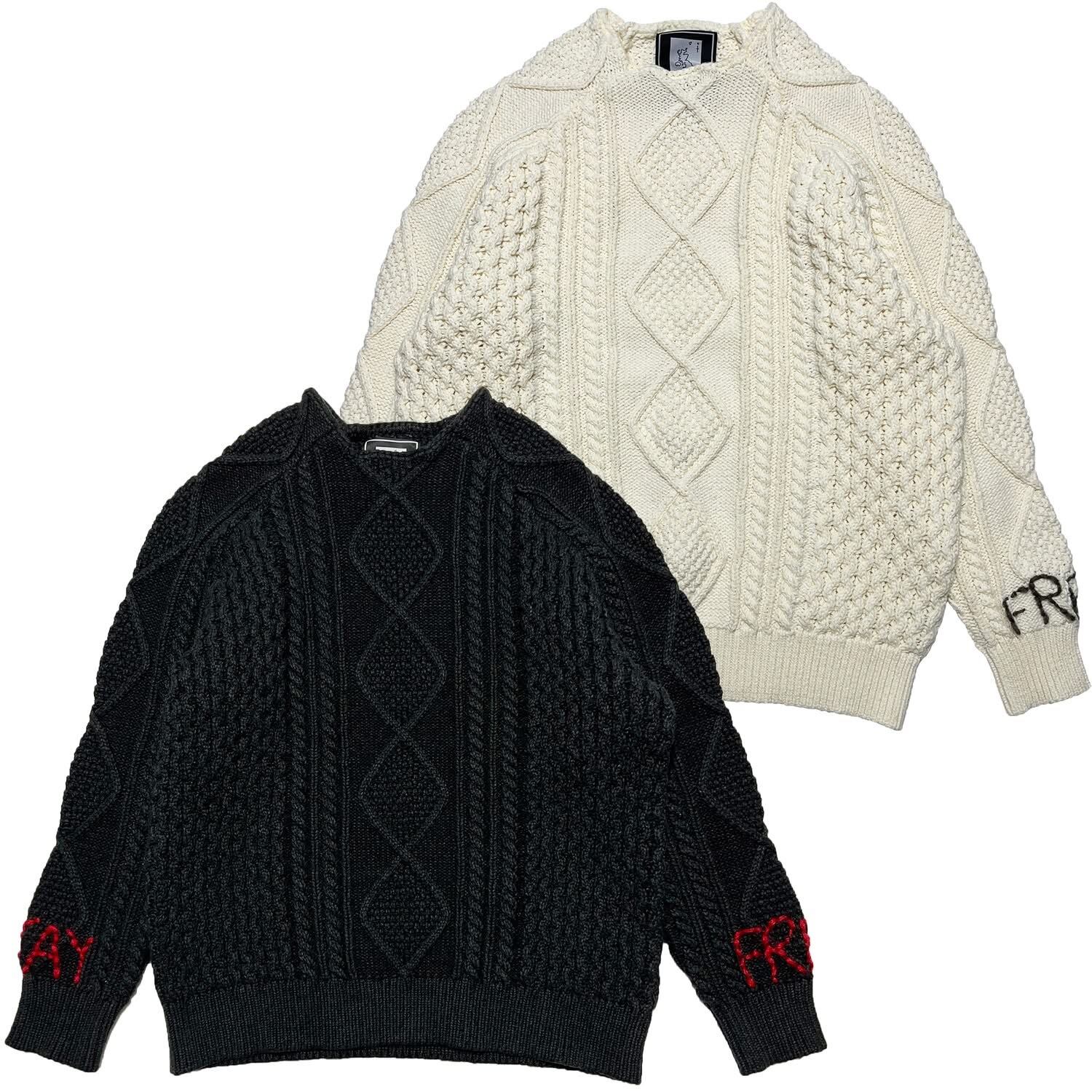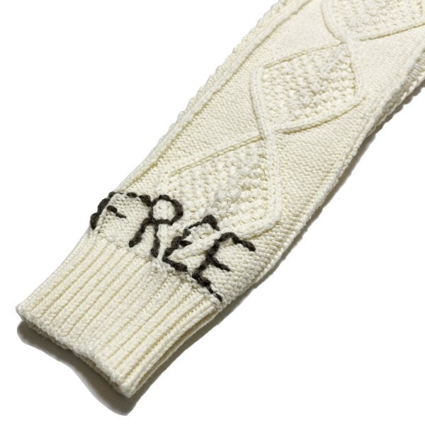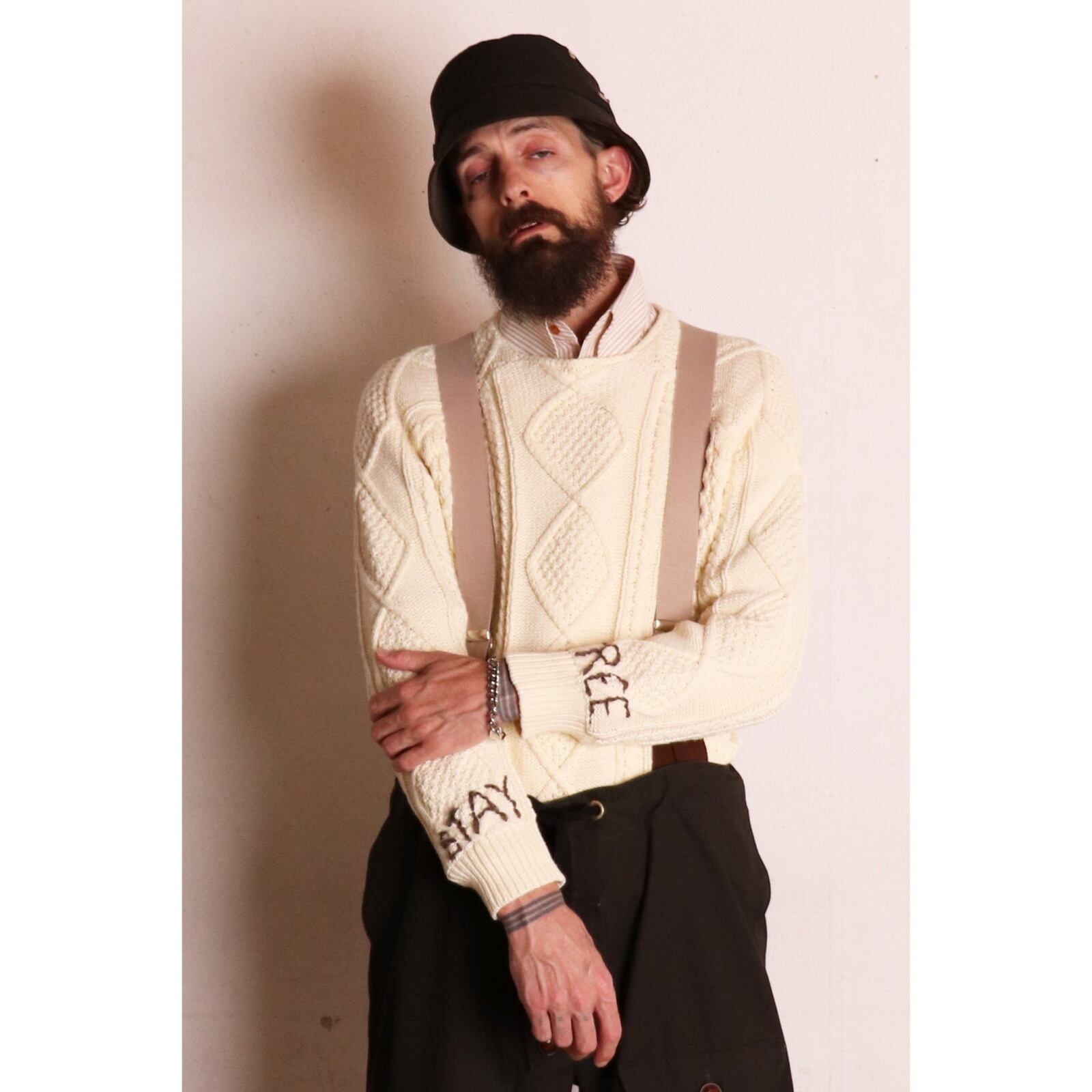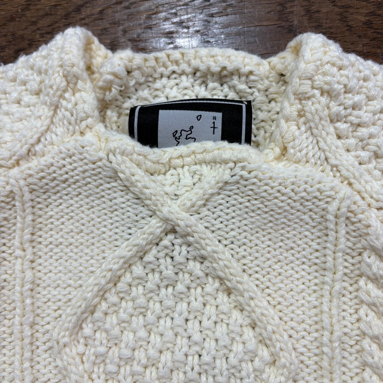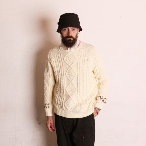袖口のハンド刺繍と、厚みのあるアラン編みが特徴的なニットジャンパー