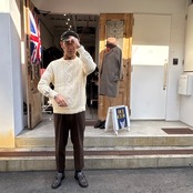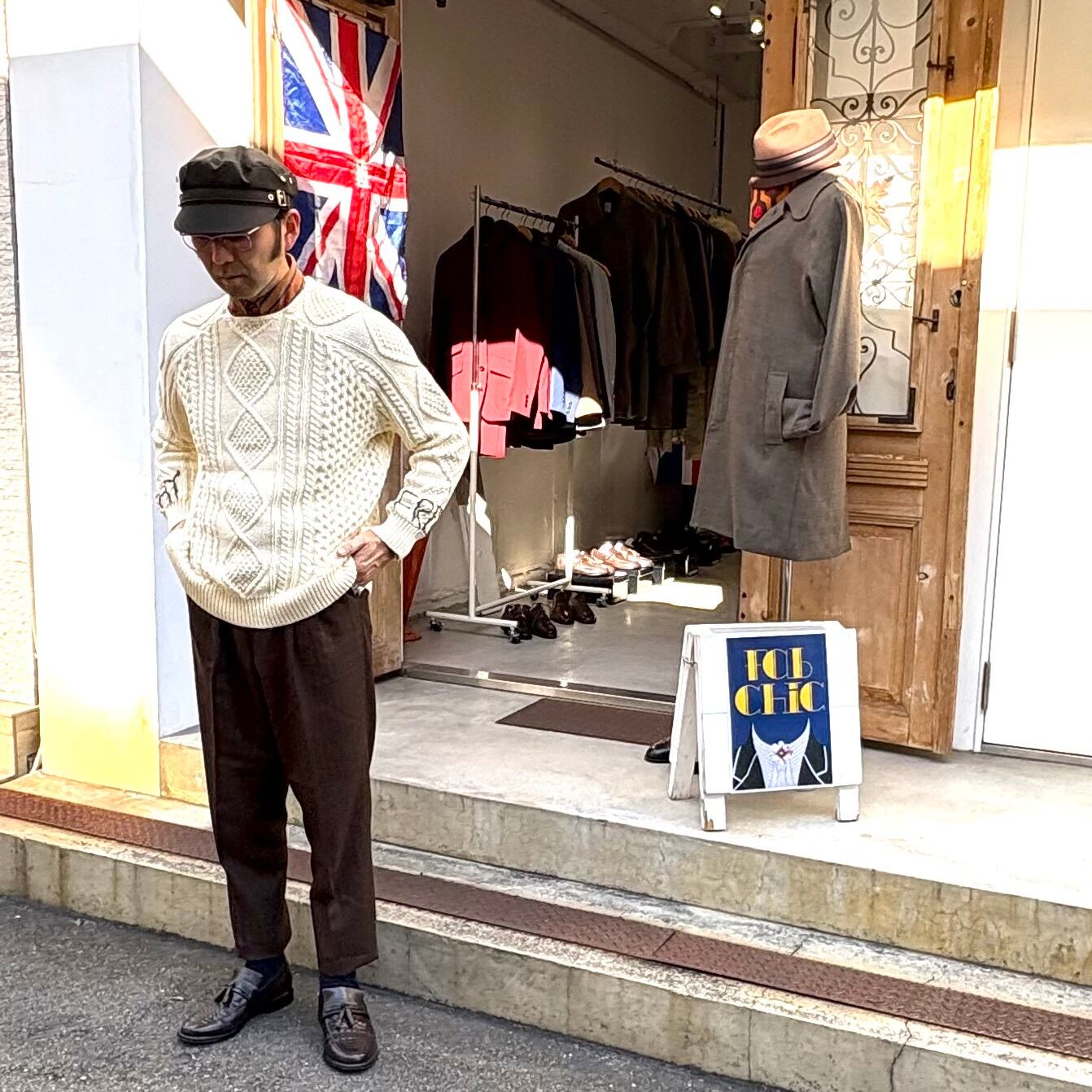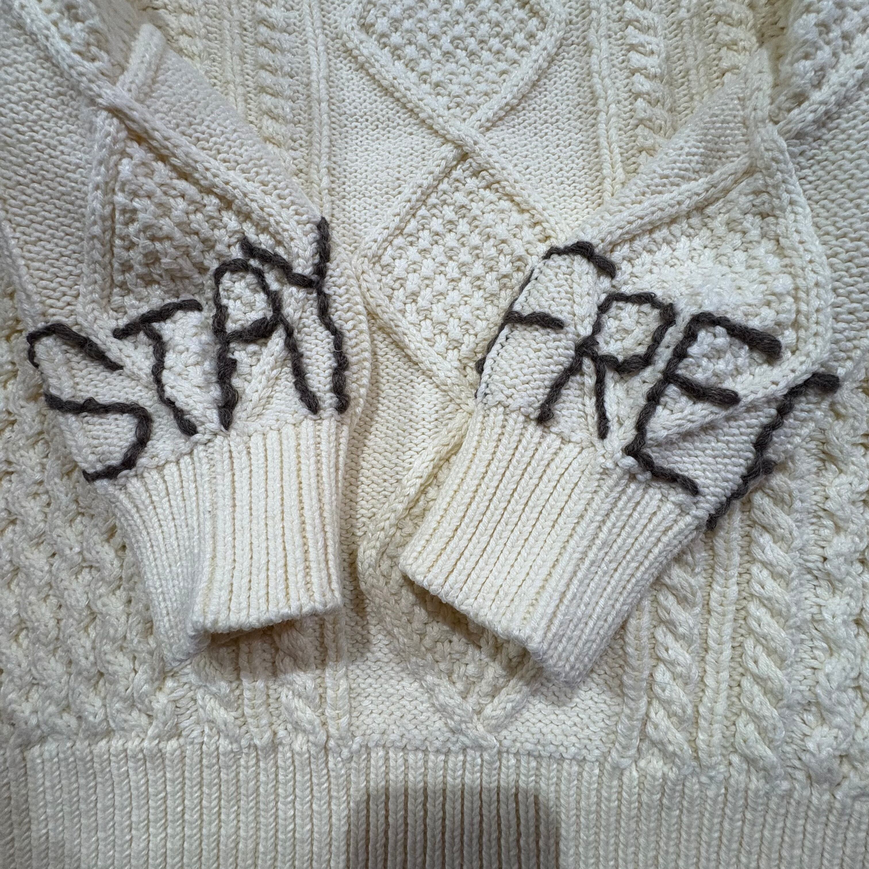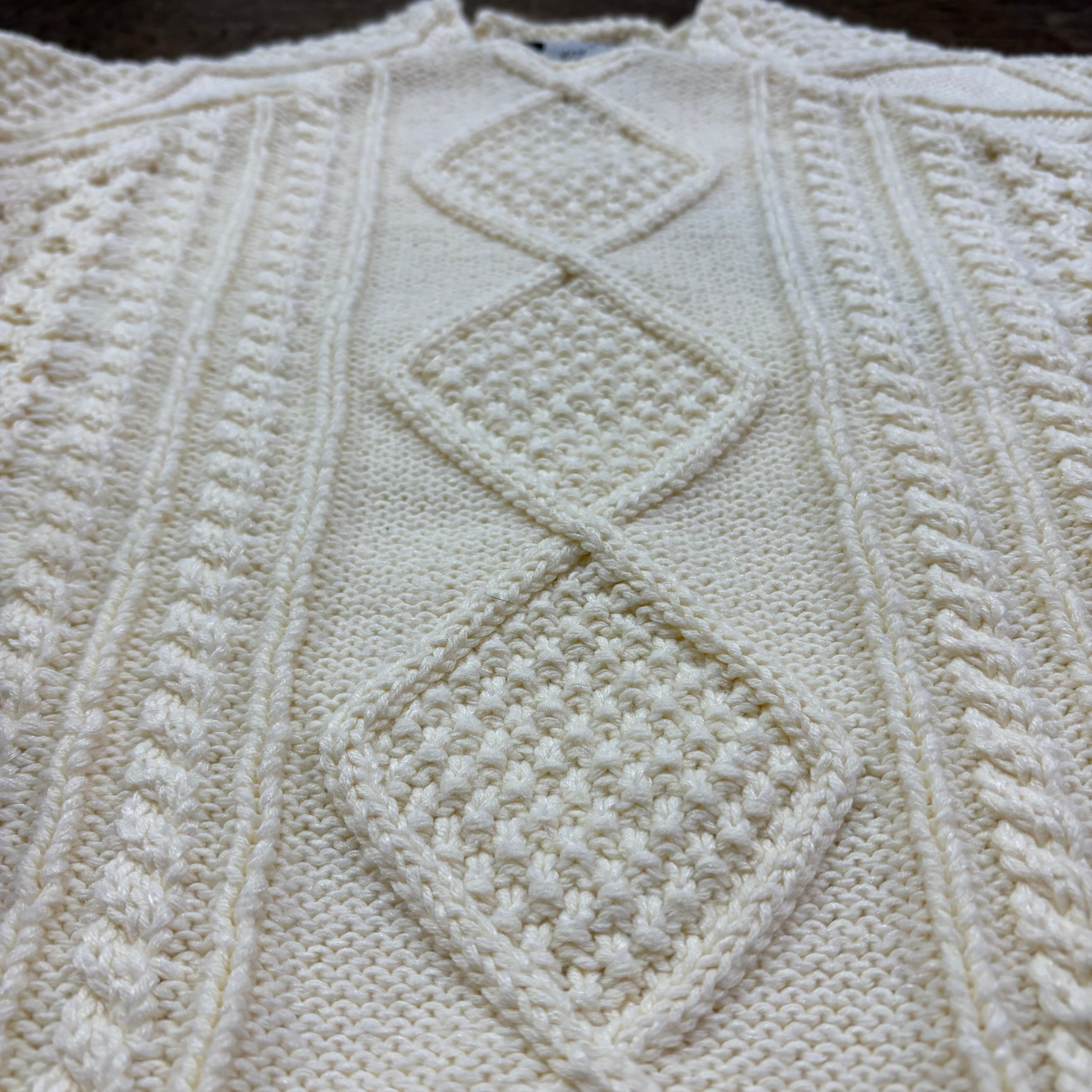 袖口のハンド刺繍と、厚みのあるアラン編みが特徴的なニットジャンパー
