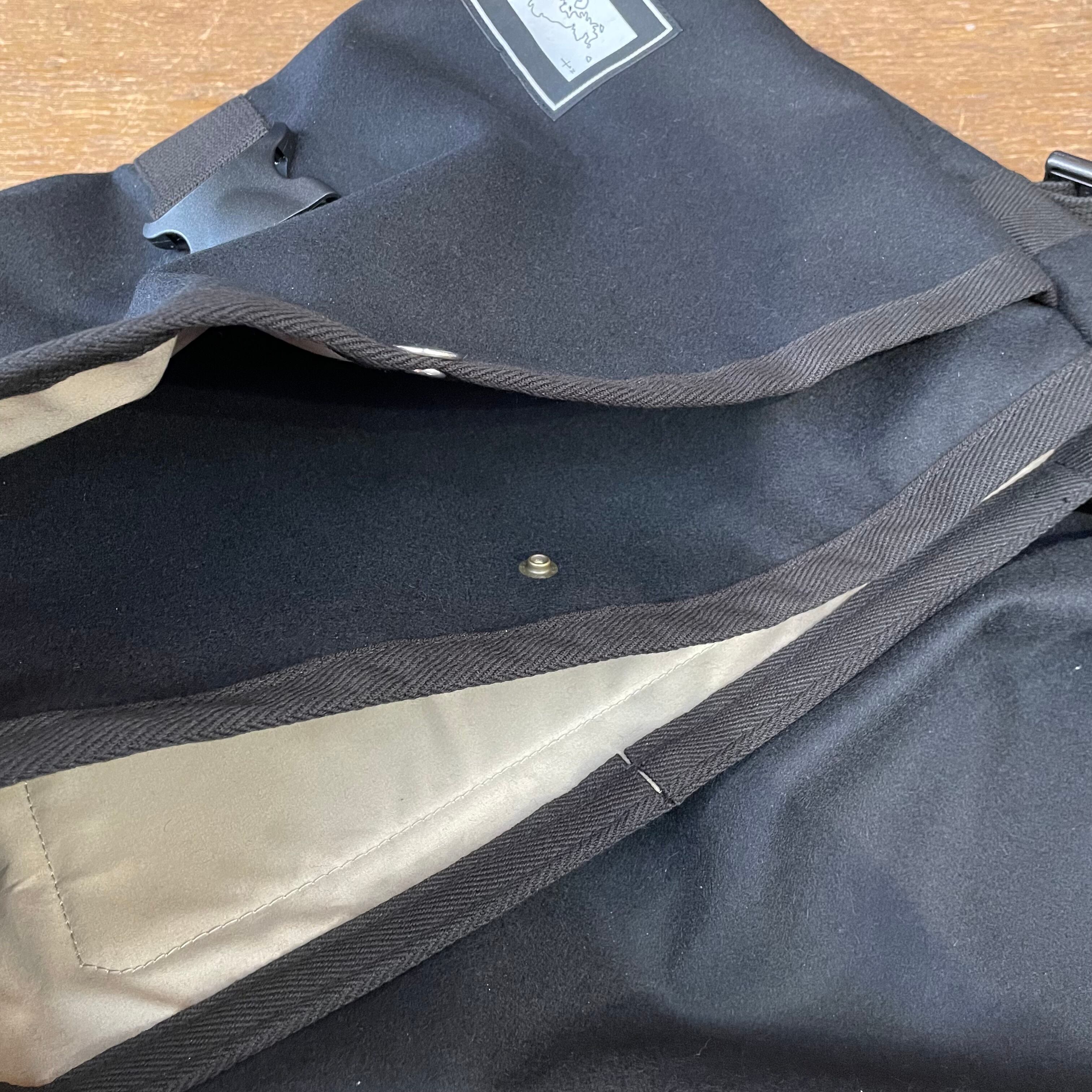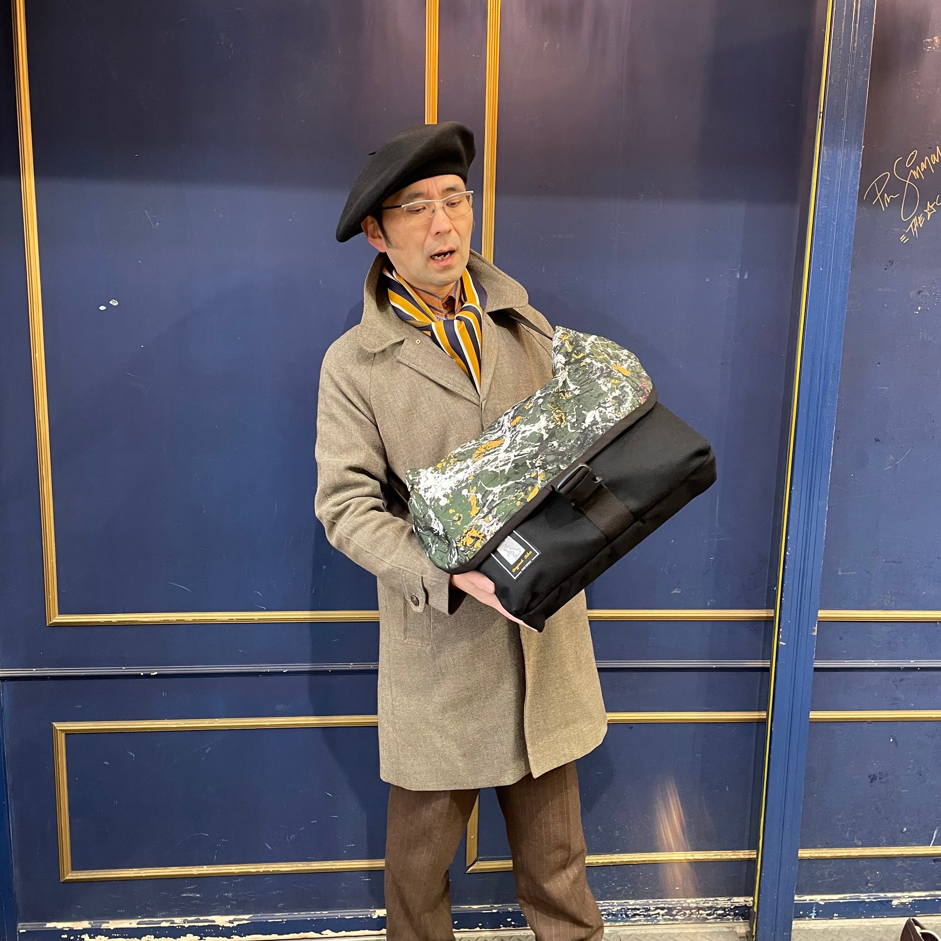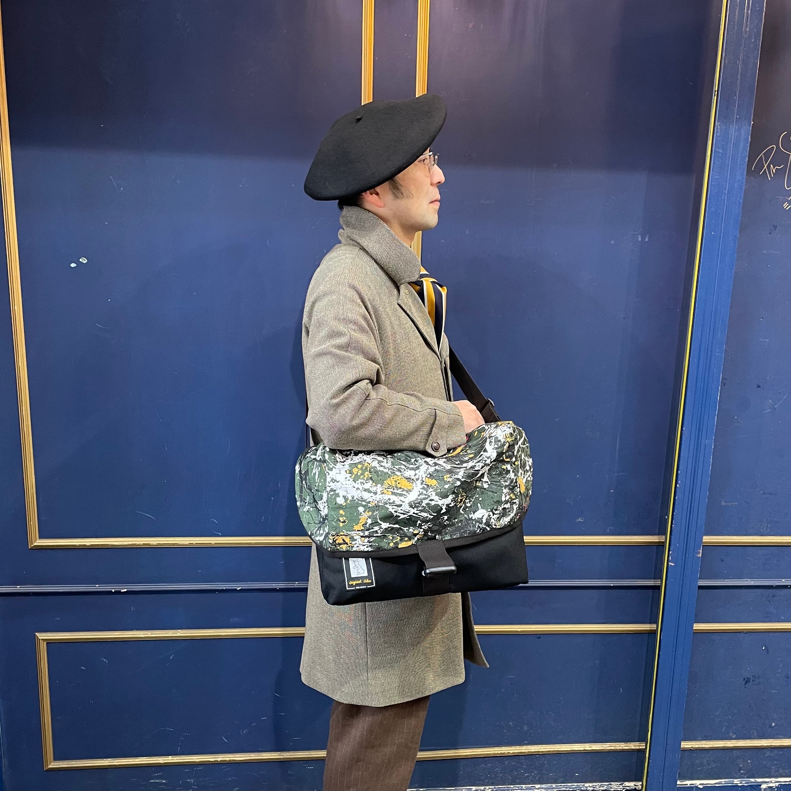 オリジナルの“DRIP PAINTING ON THE BRICK WALL”柄ポリエステル地で仕立てた、容量たっぷりのメッセンジャーバッグ。