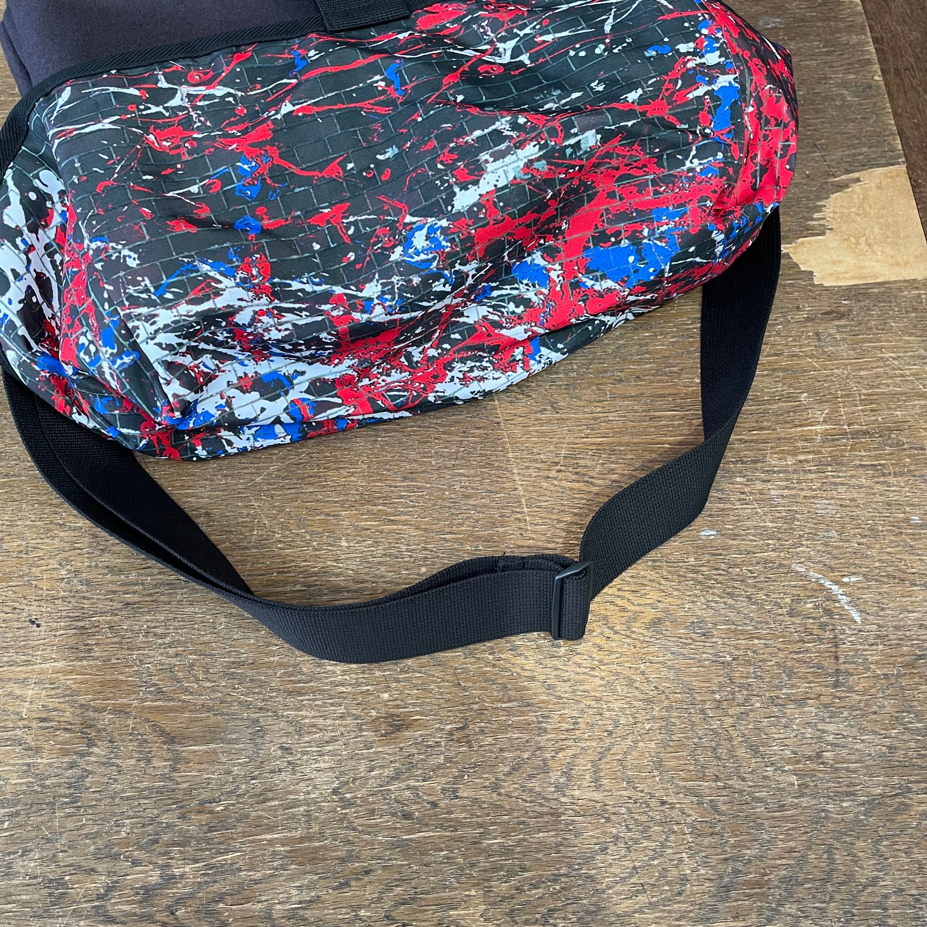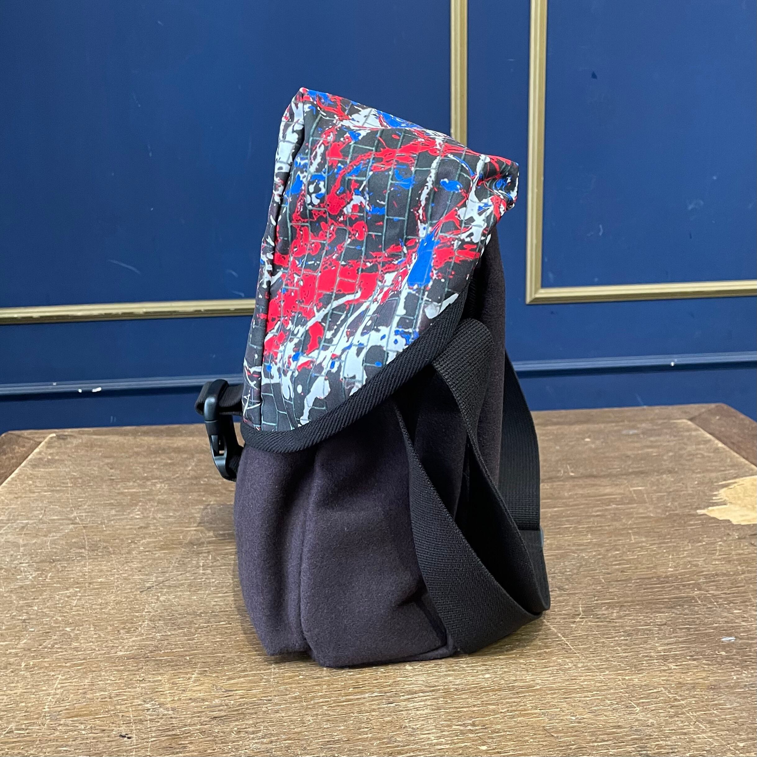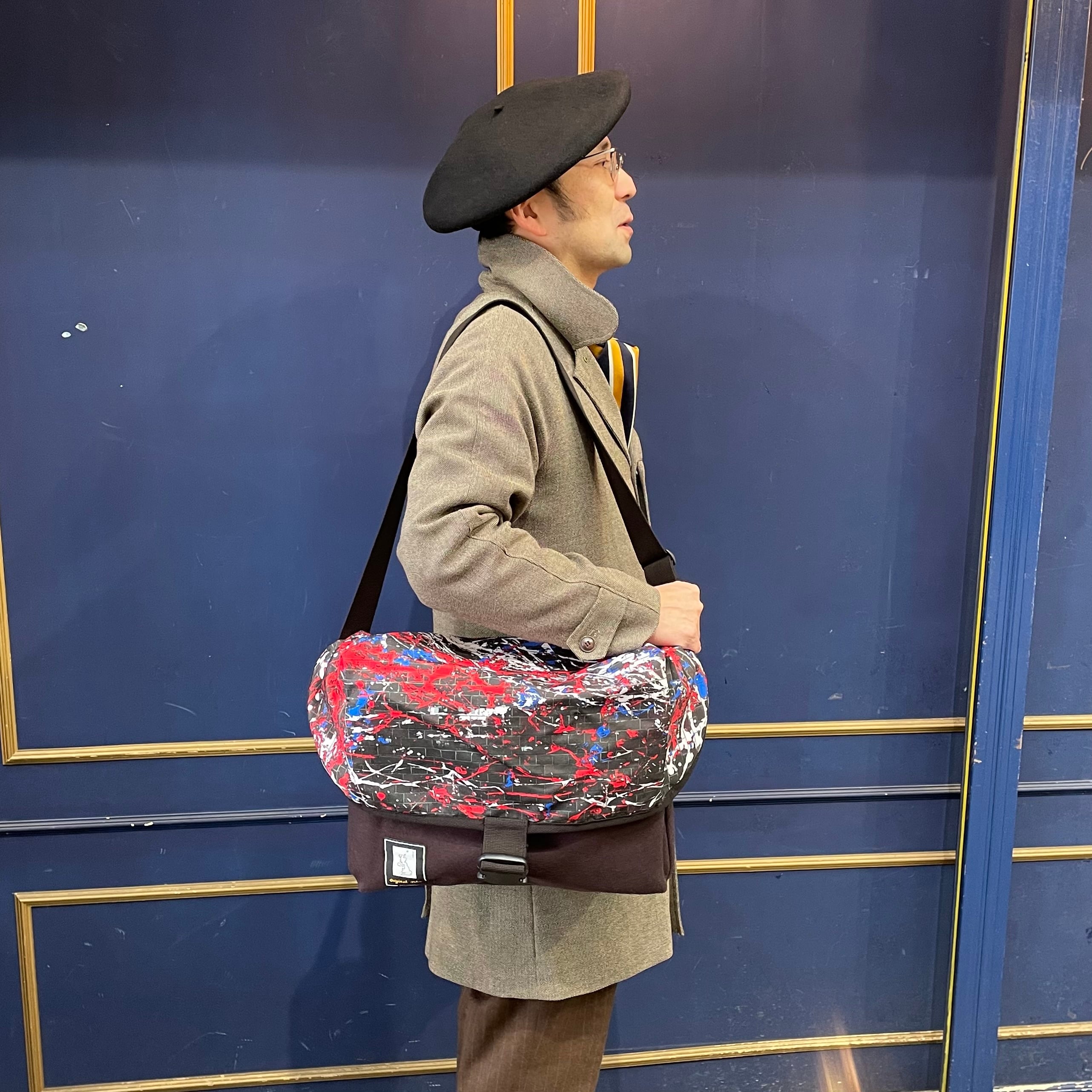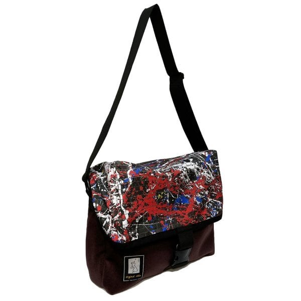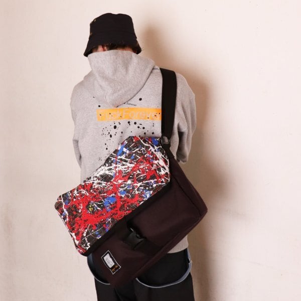 オリジナルの“DRIP PAINTING ON THE BRICK WALL”柄ポリエステル地で仕立てた、容量たっぷりのメッセンジャーバッグ。