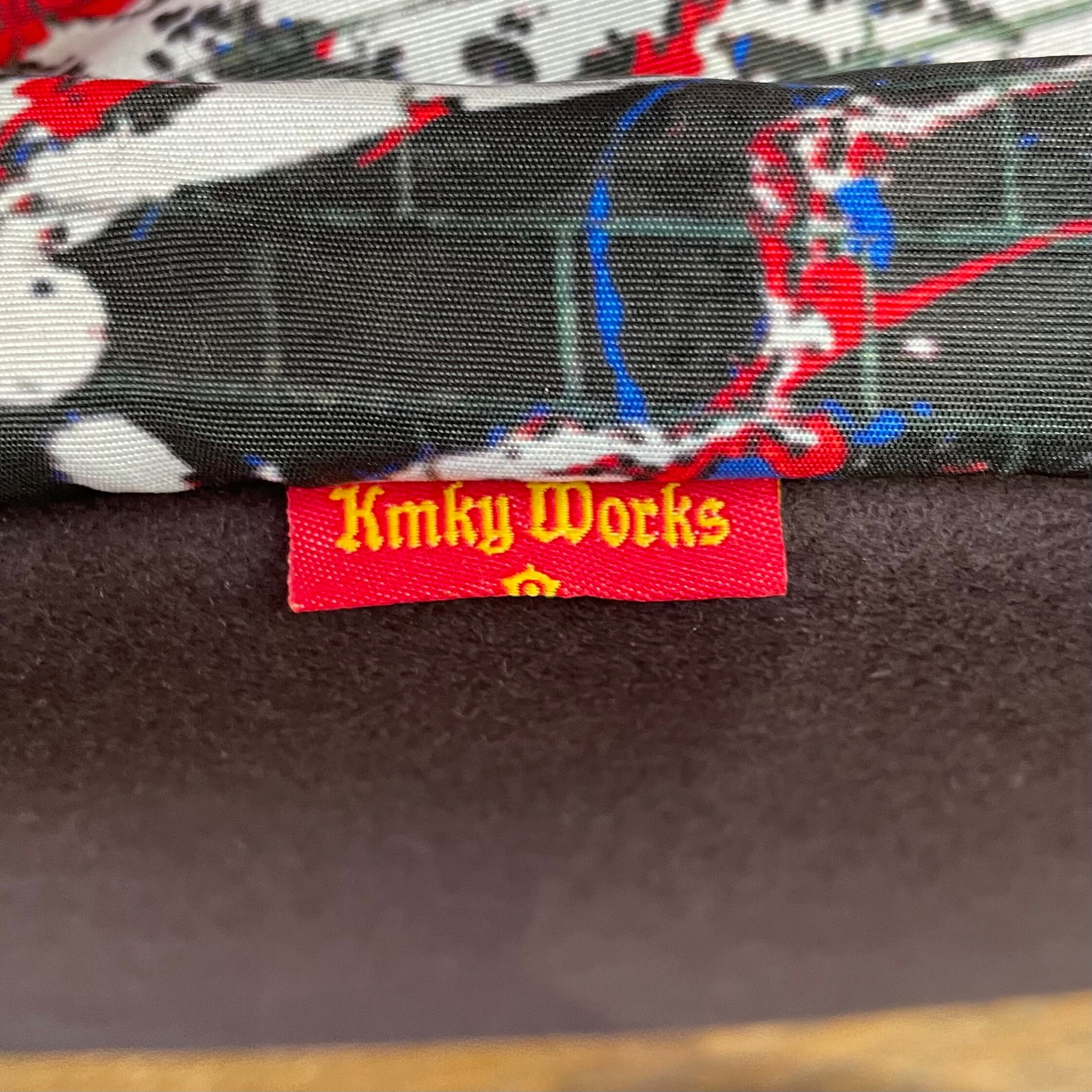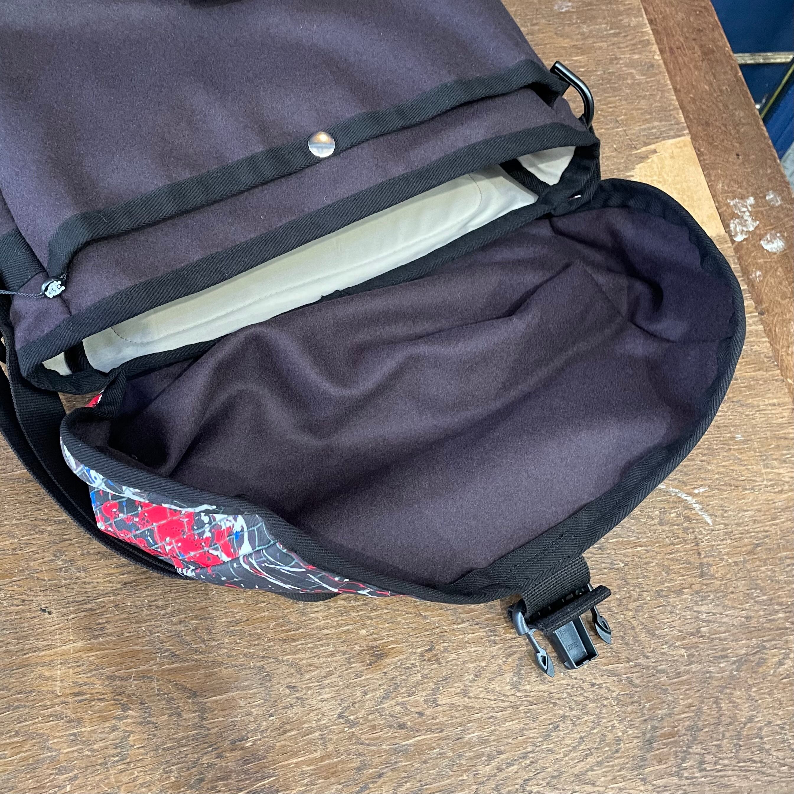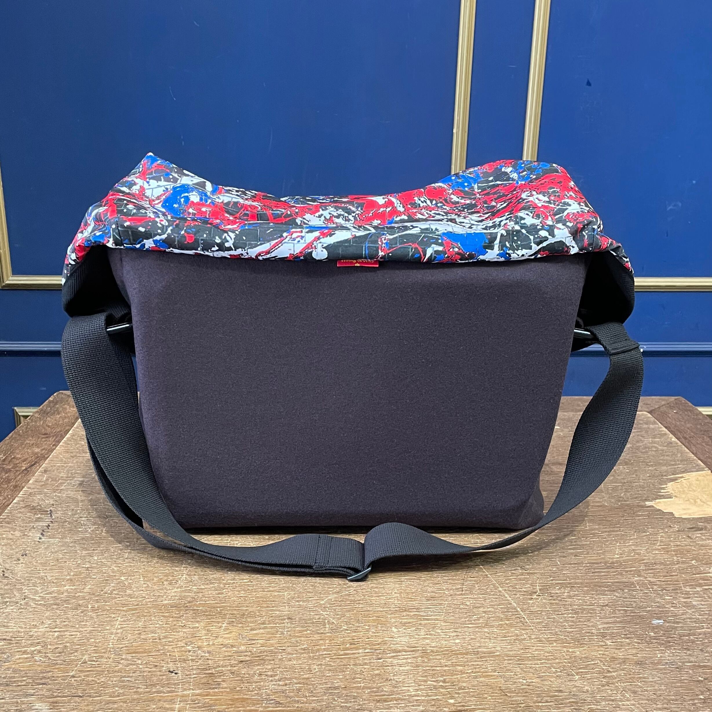 オリジナルの“DRIP PAINTING ON THE BRICK WALL”柄ポリエステル地で仕立てた、容量たっぷりのメッセンジャーバッグ。