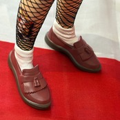 ボタンダウンシャツ、スカート、フィッシュネット、ローファーといったスキンズ定番の組み合わせ