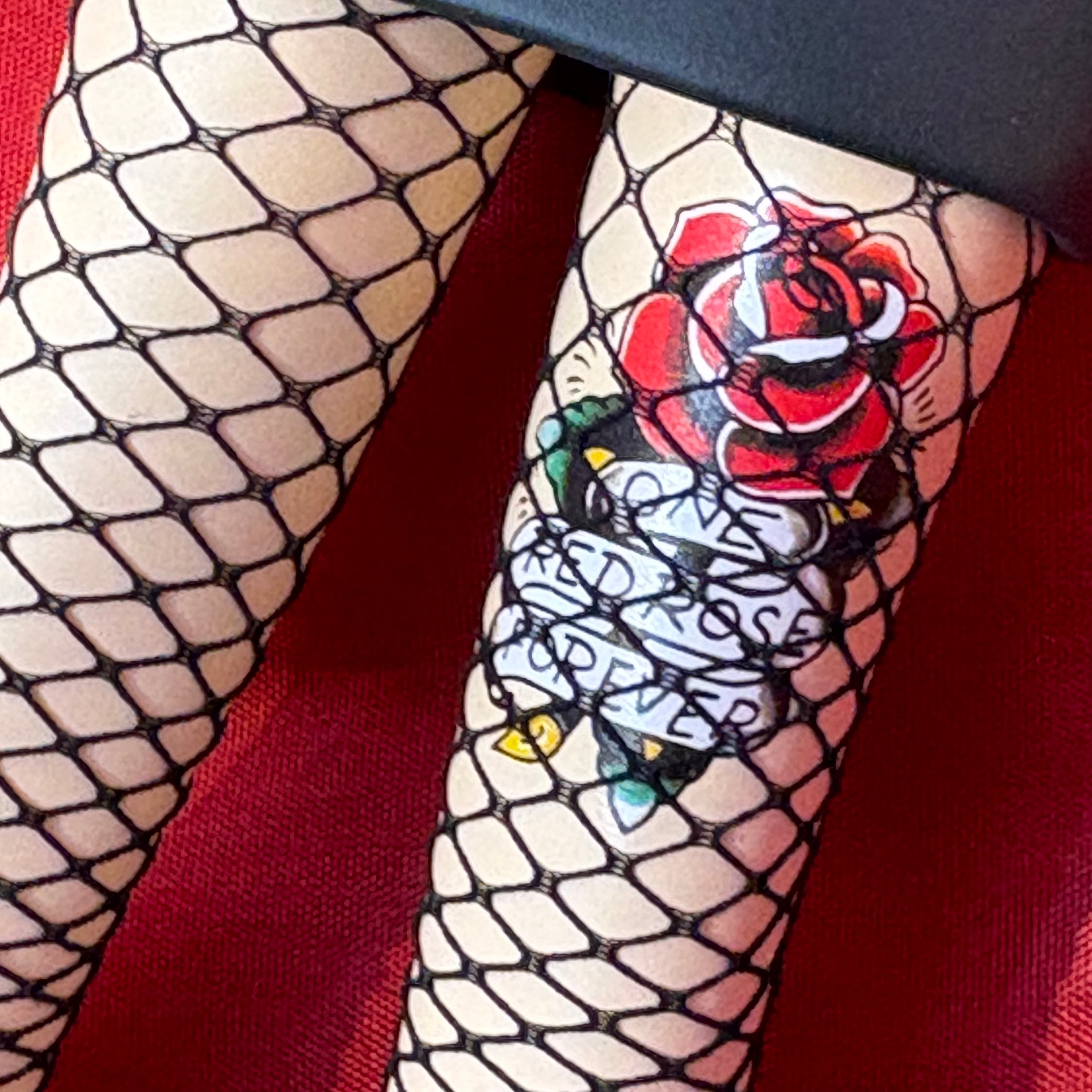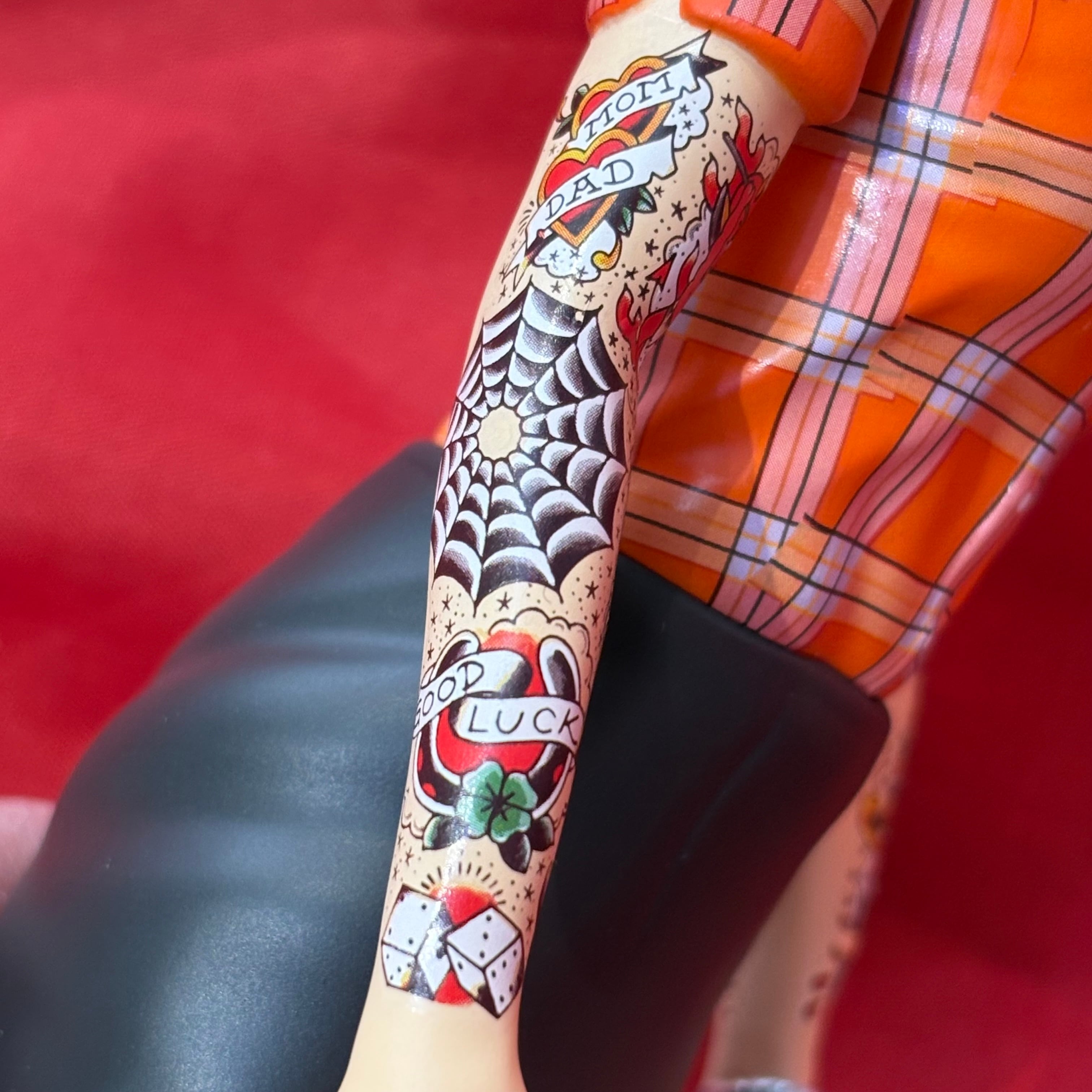 トラディショナルタトゥーをモチーフにしたアートワークを腕・脚に配置