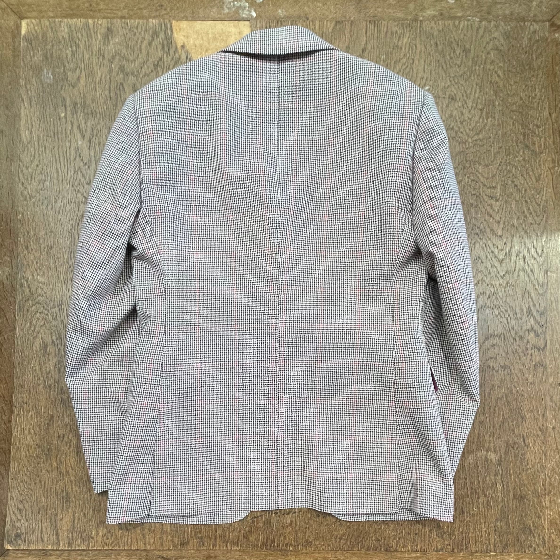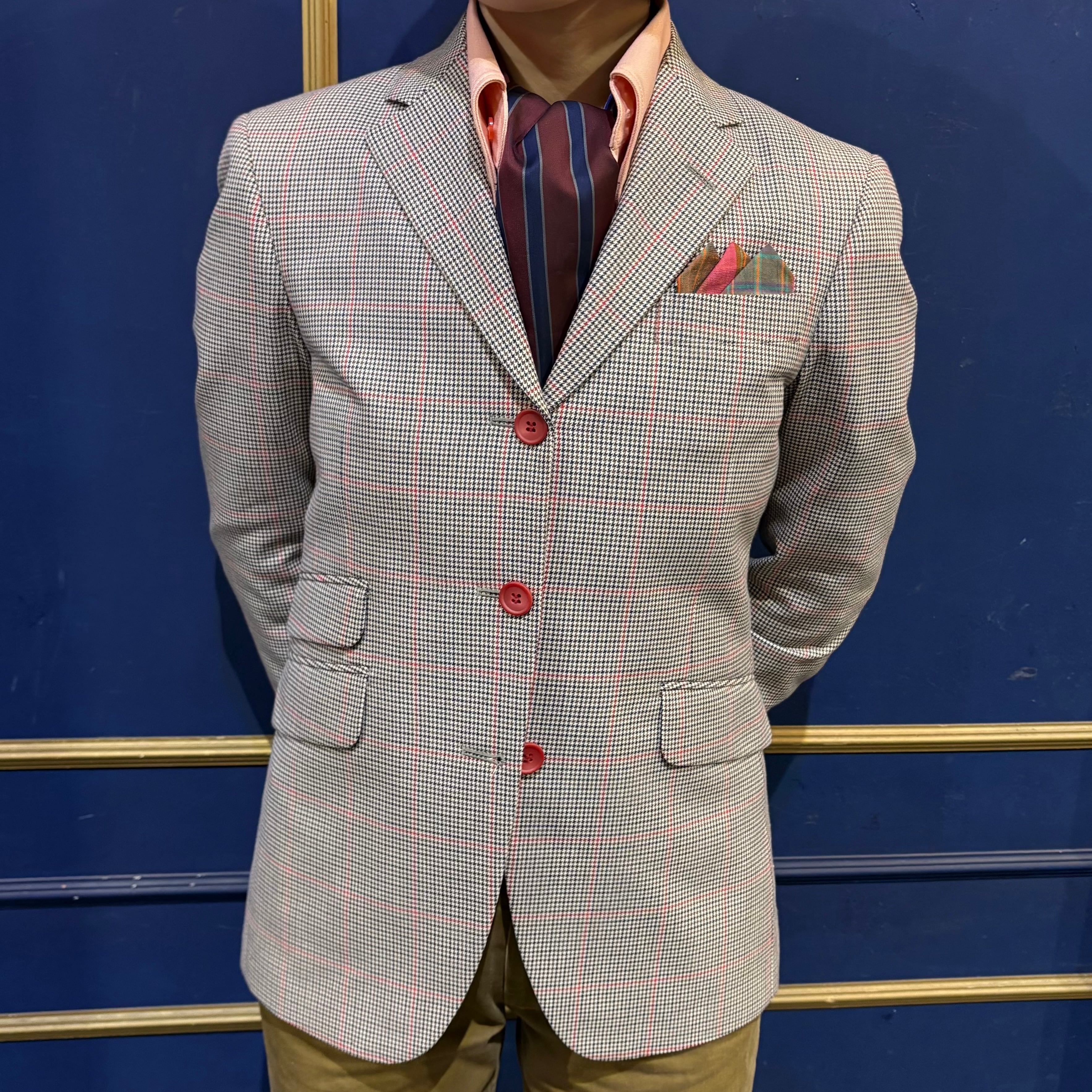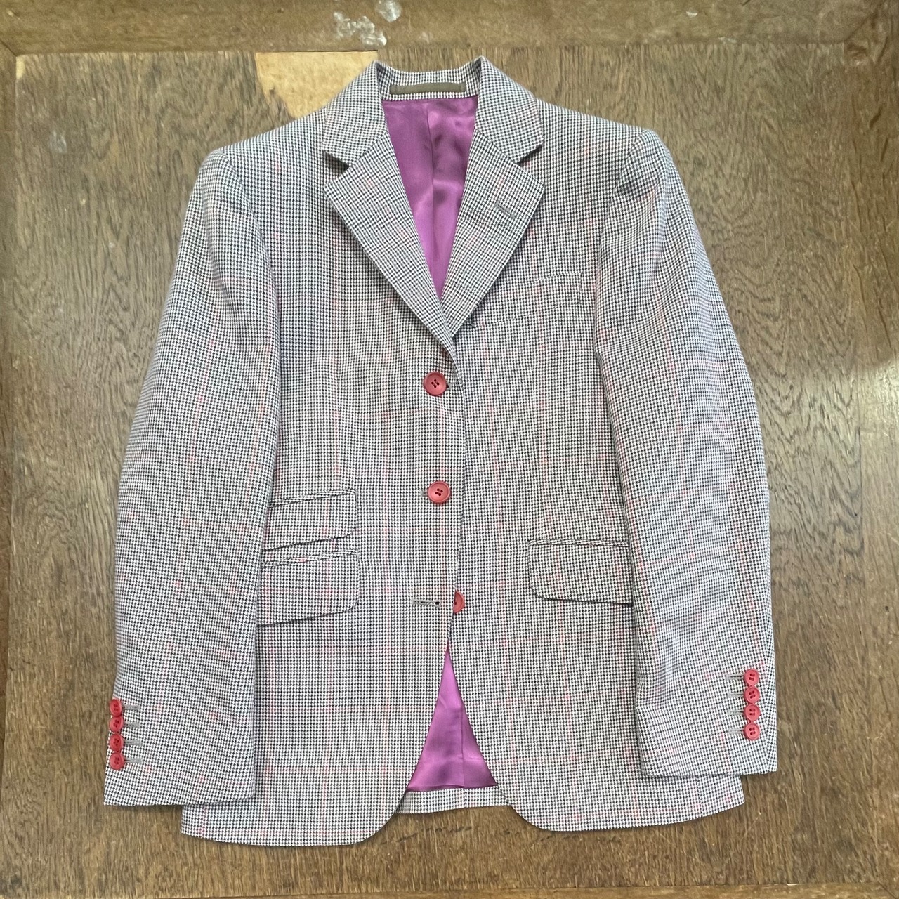 チェンジポケットつき、サイドベンツ、本切羽(袖口があきます)、ピンクのボタンが絶妙なアクセントに。