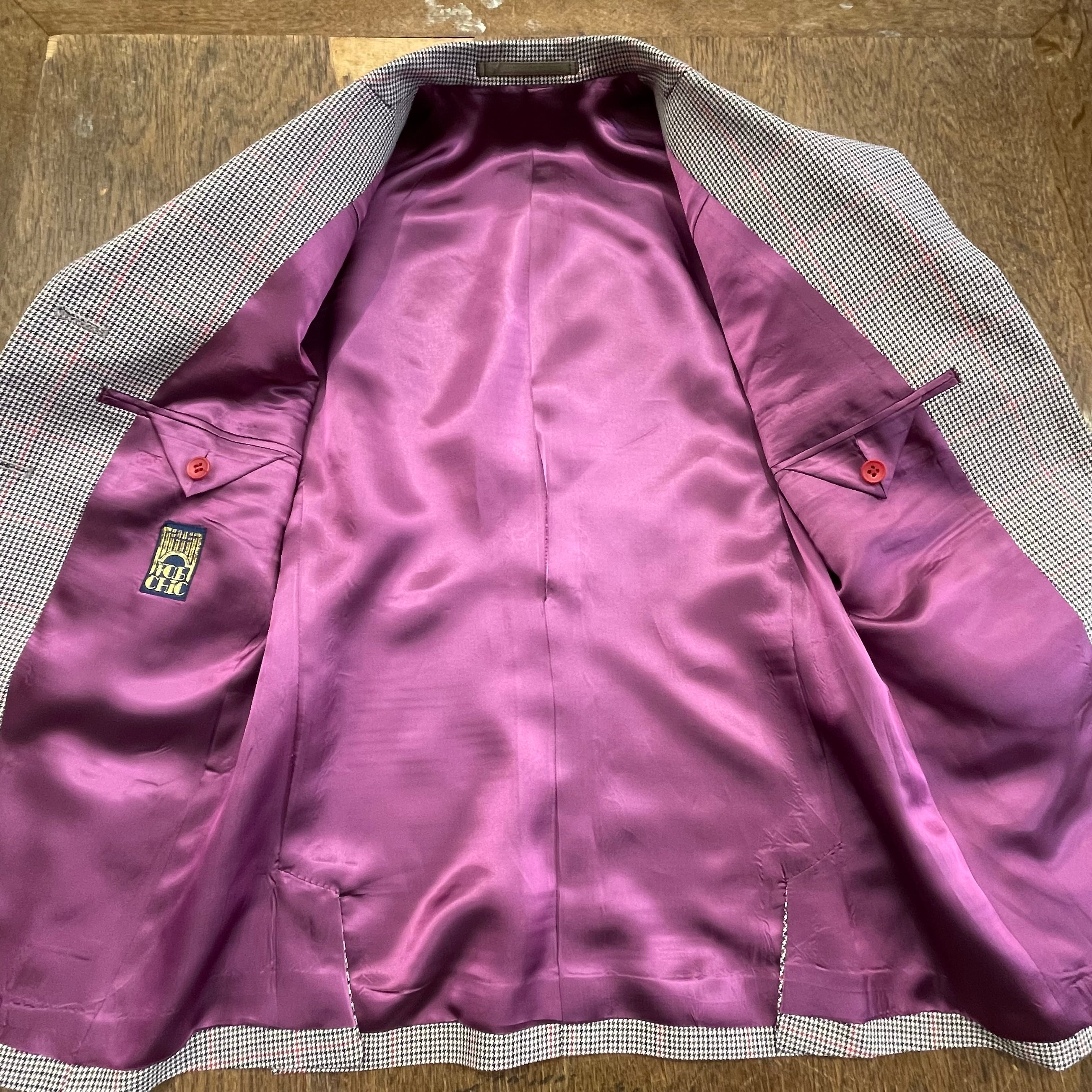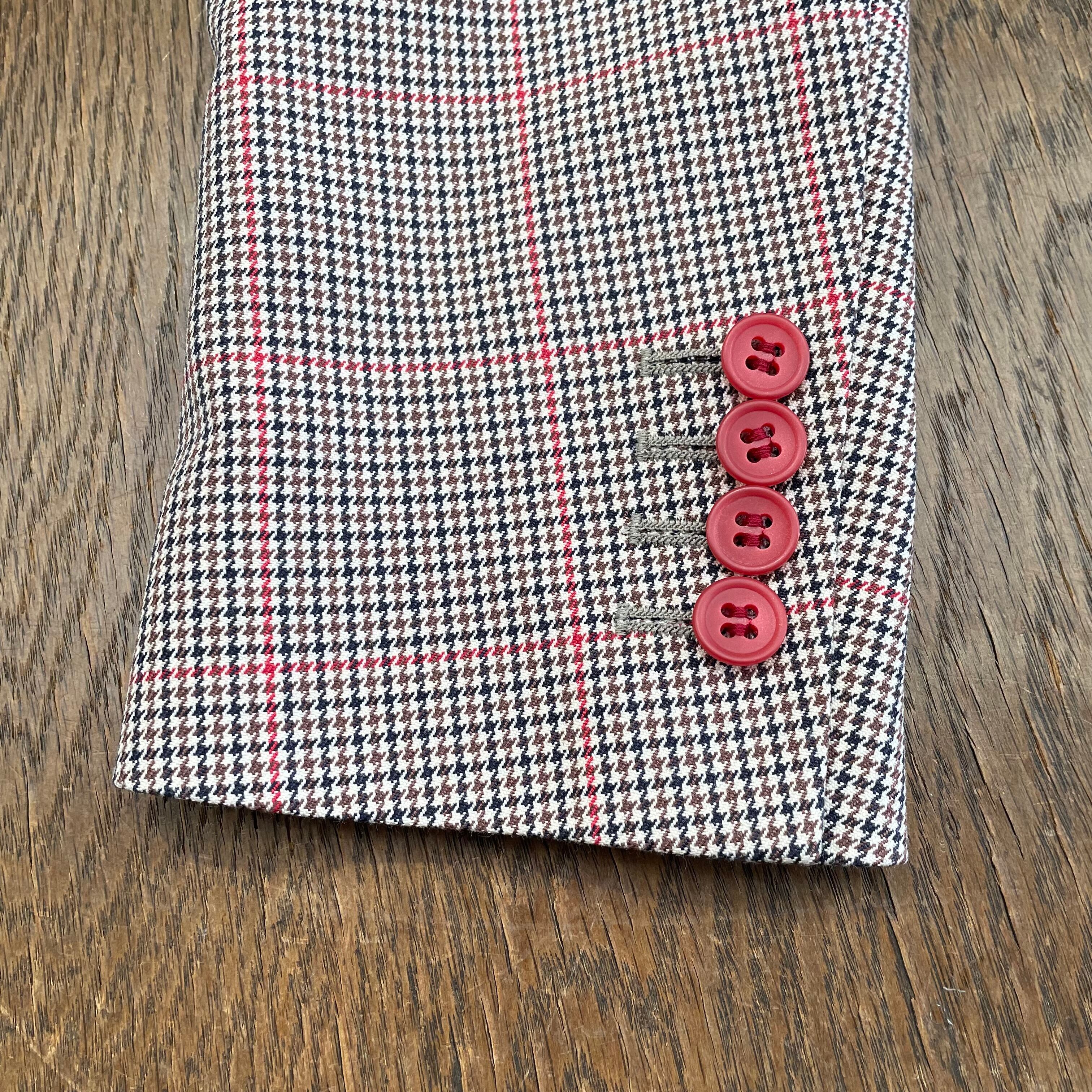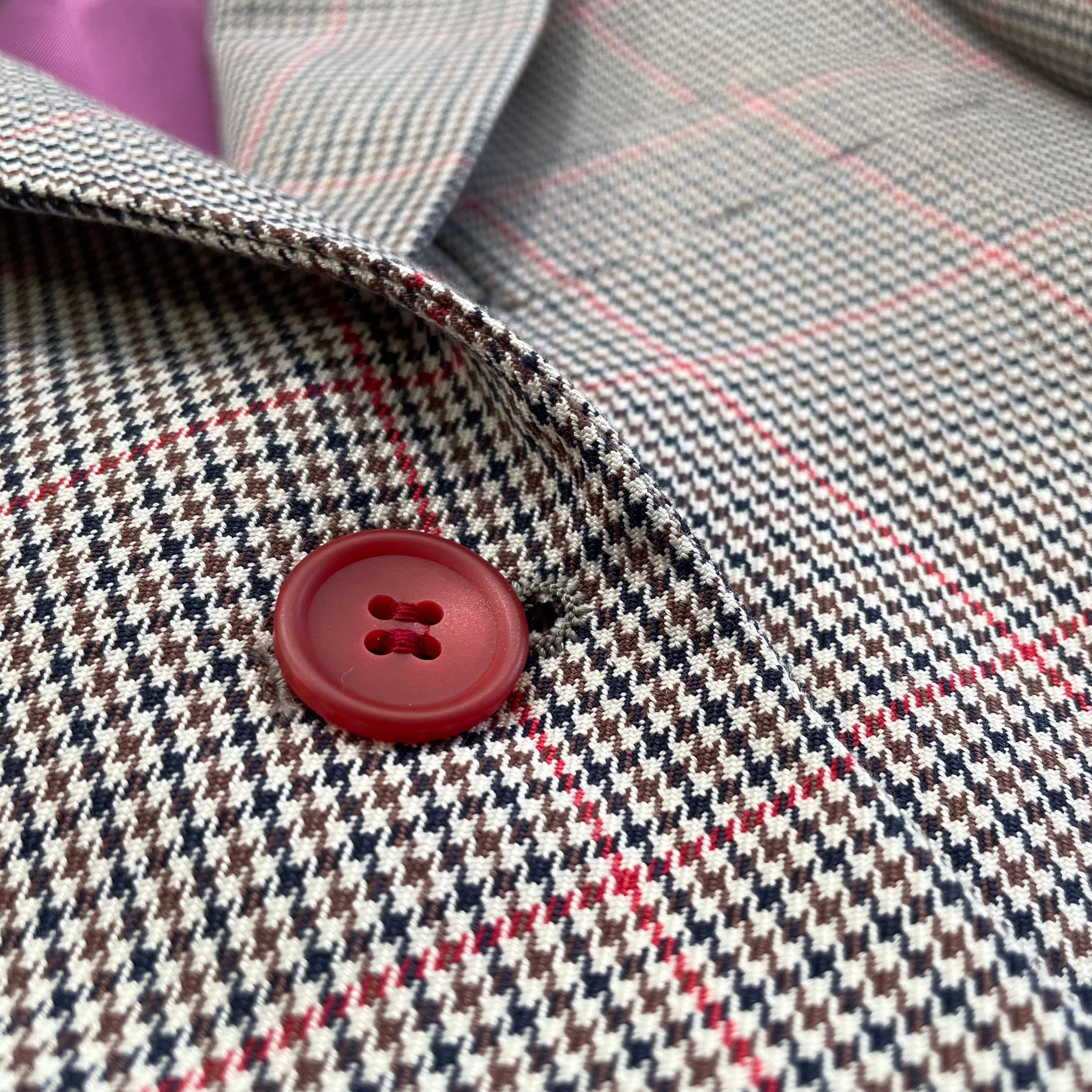 チェンジポケットつき、サイドベンツ、本切羽(袖口があきます)、ピンクのボタンが絶妙なアクセントに。
