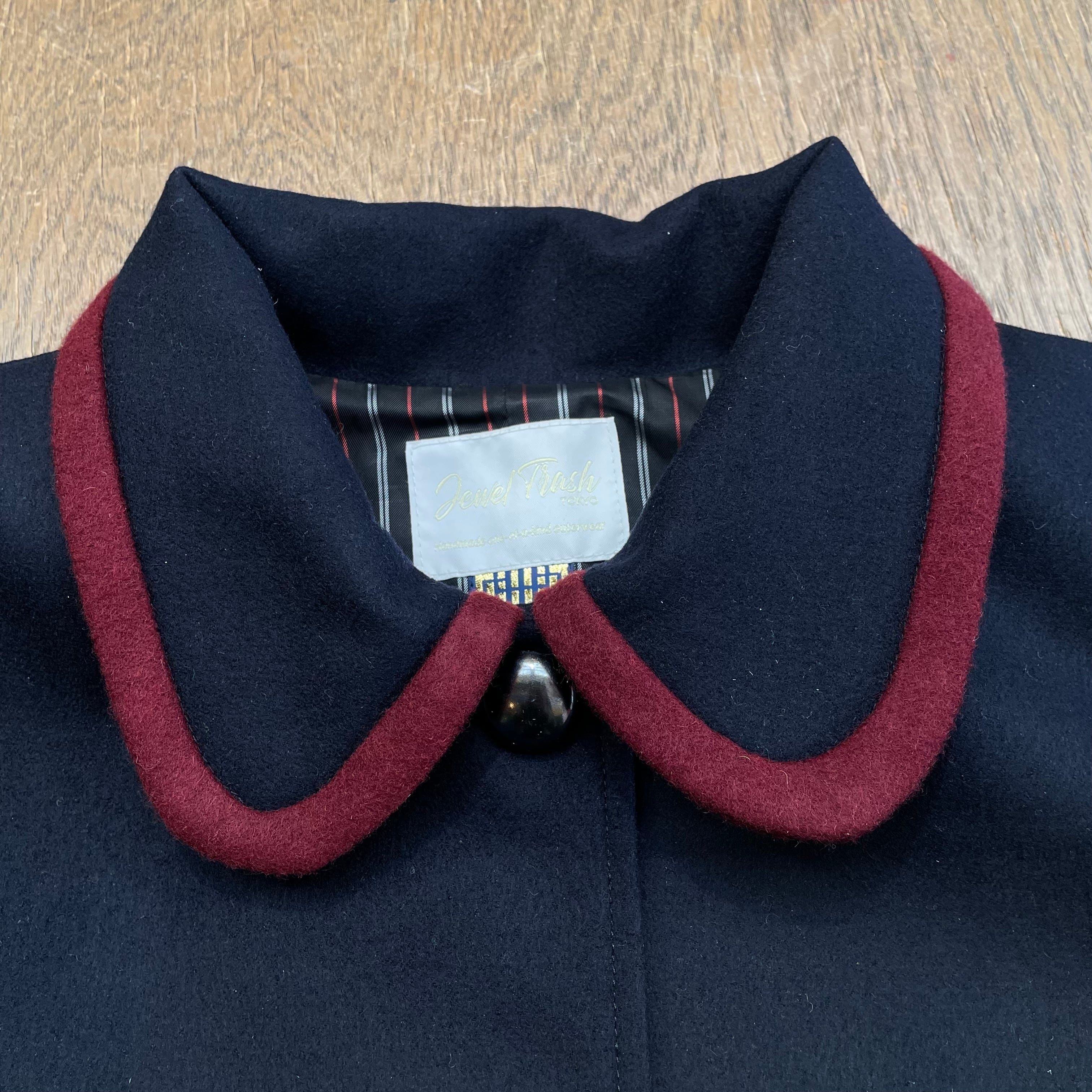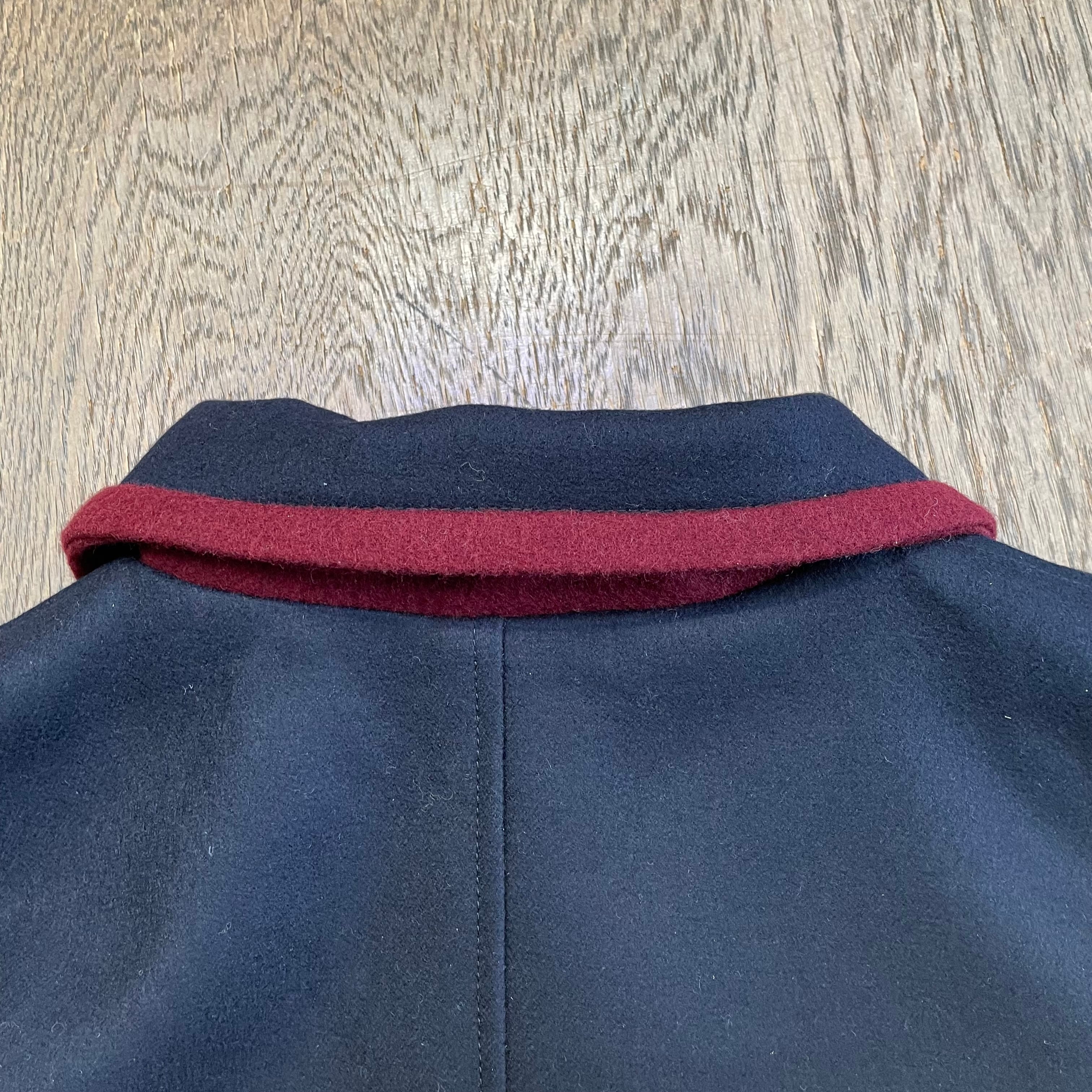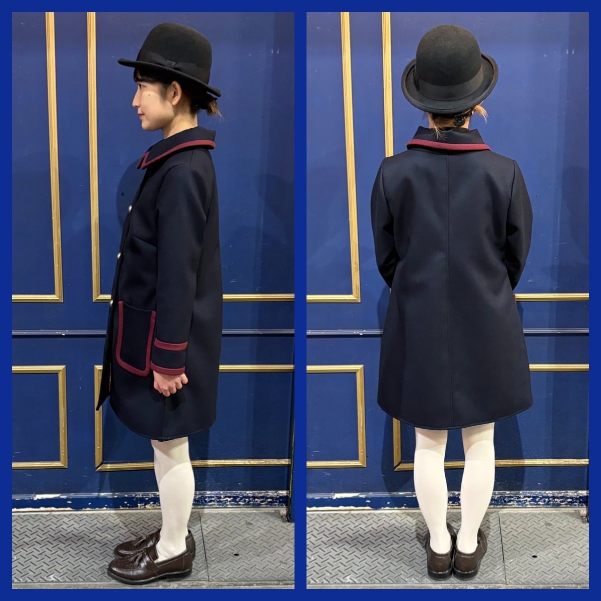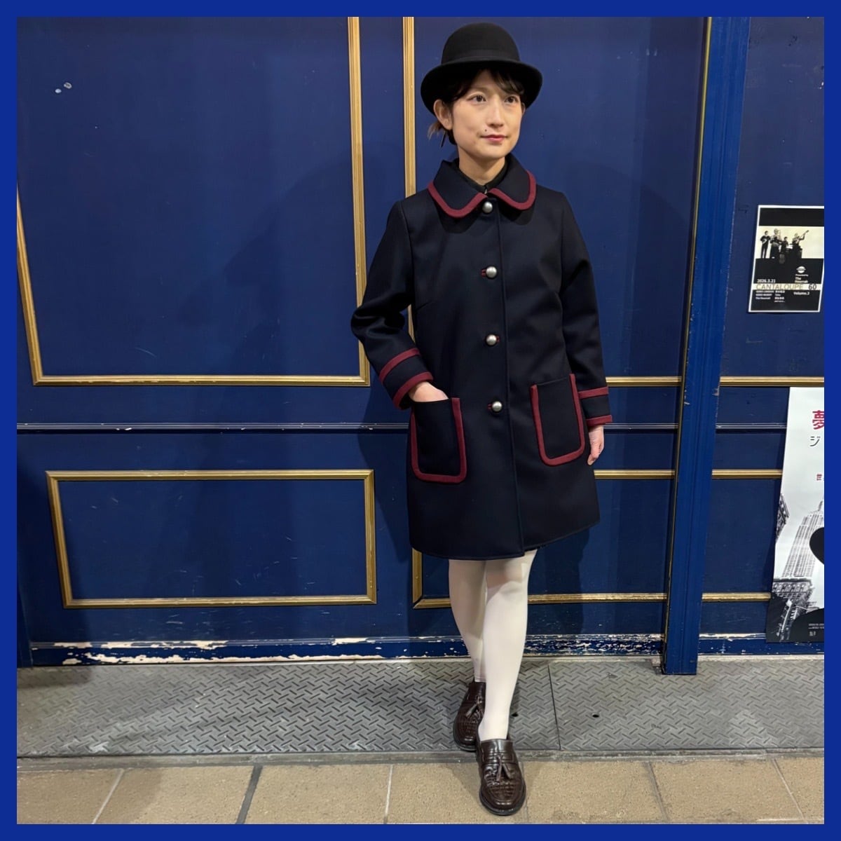 ダークネイビーの生地にワインレッドのパイピングが映えるレトロなコート。