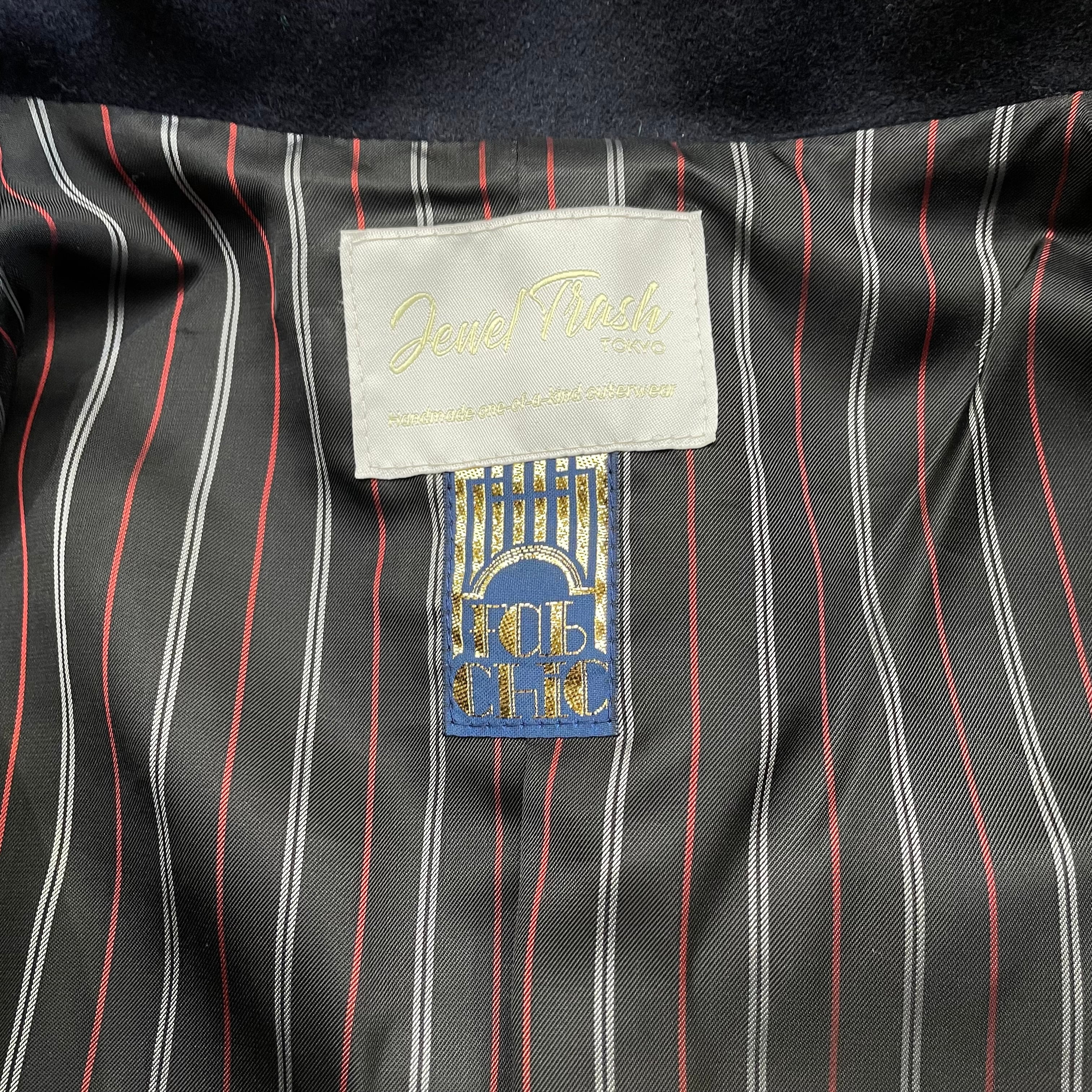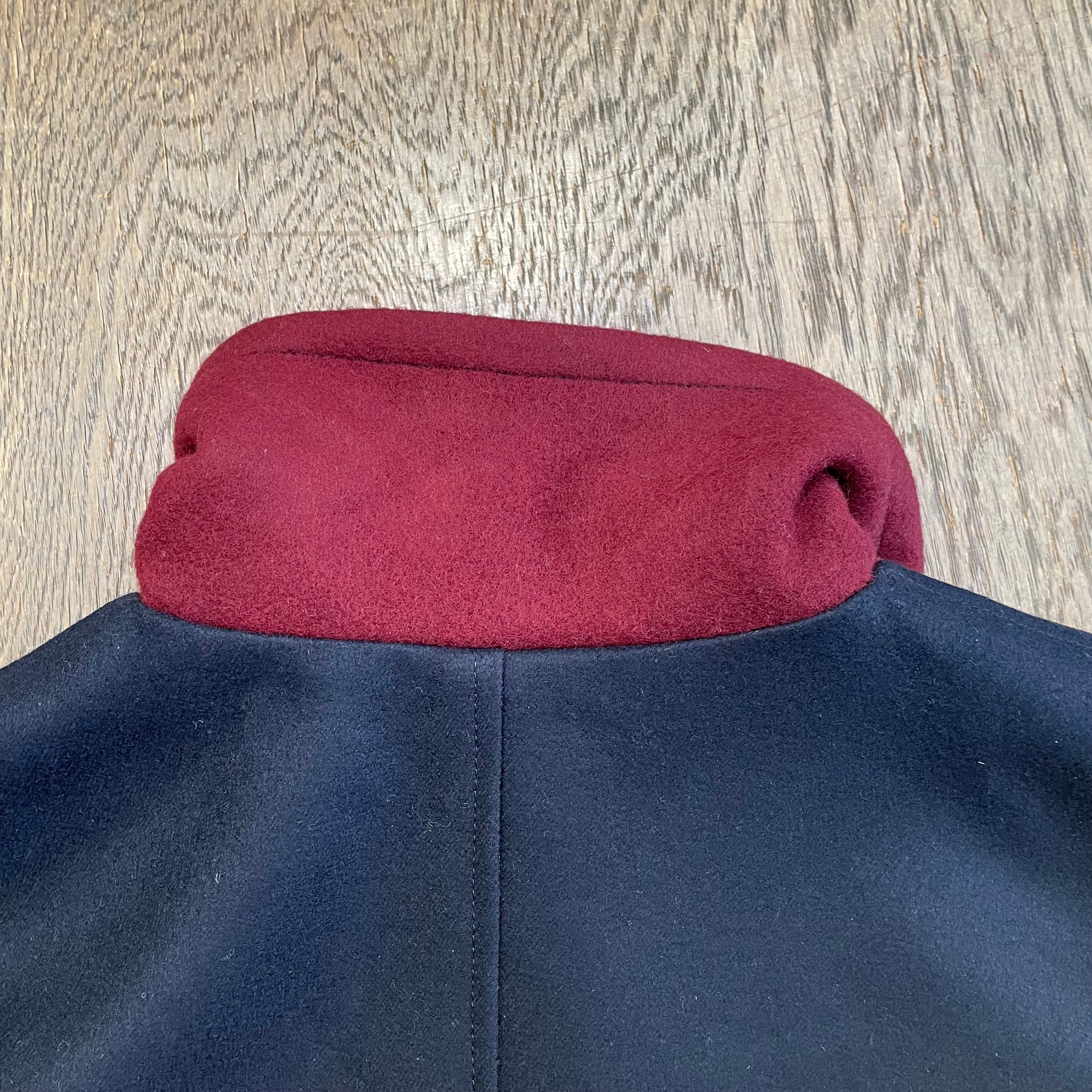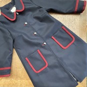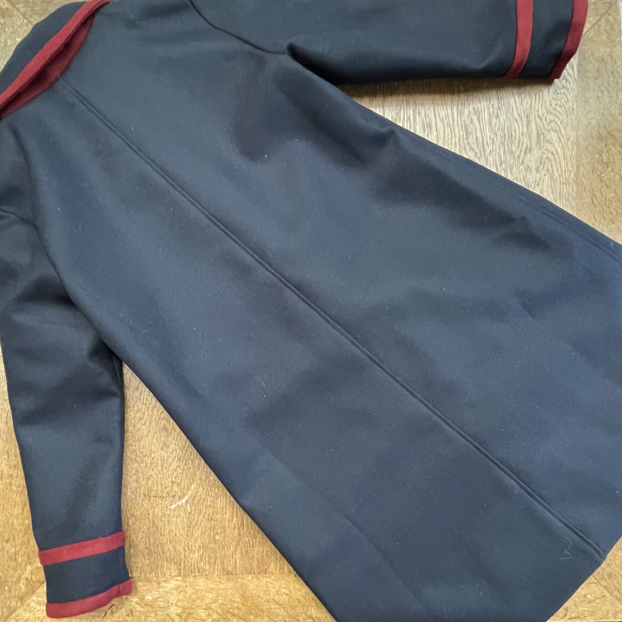 ダークネイビーの生地にワインレッドのパイピングが映えるレトロなコート。