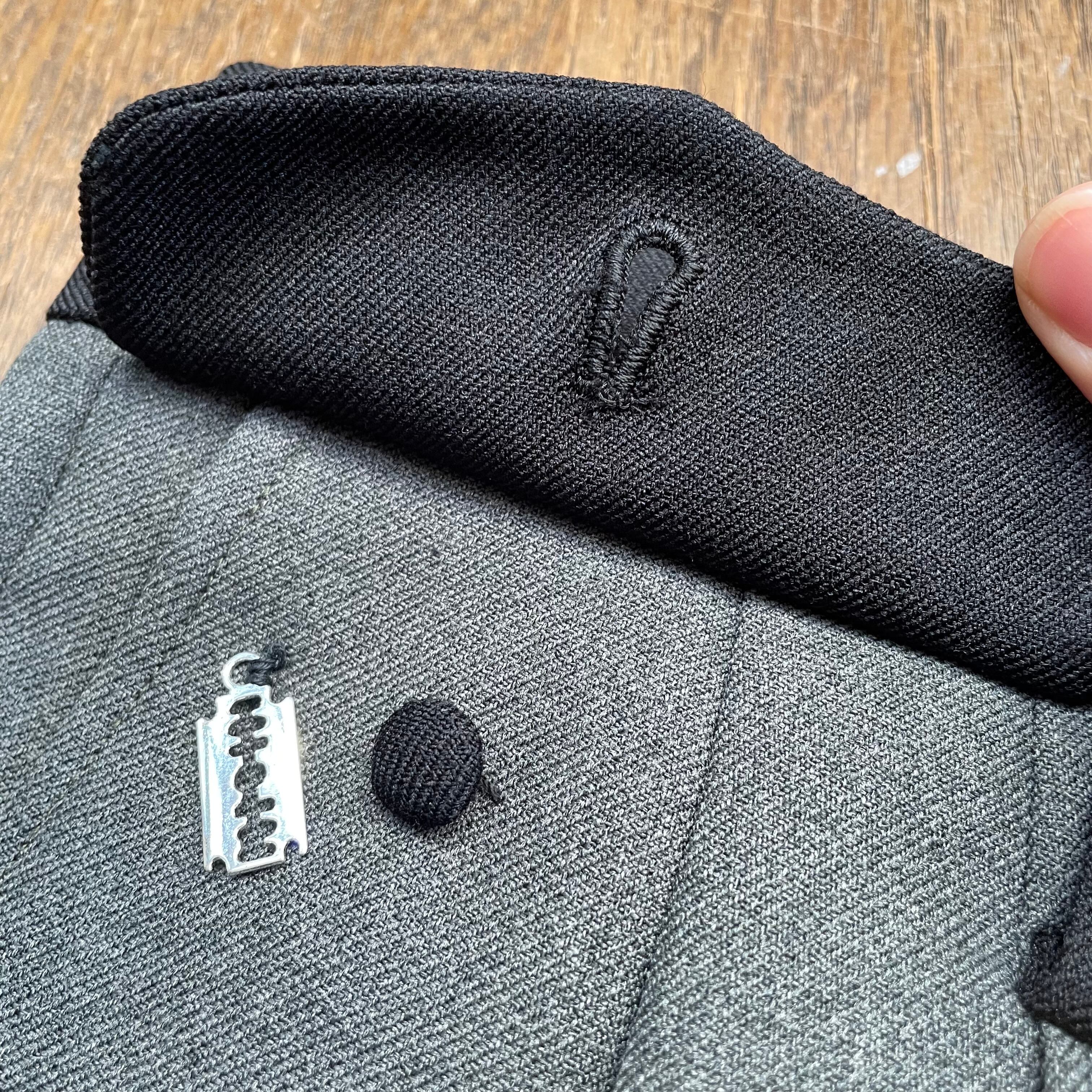 ウェストベルトやフラップを共生地のブラックで切り替え、フロントフラップに隠れて”カミソリチャーム"付き。