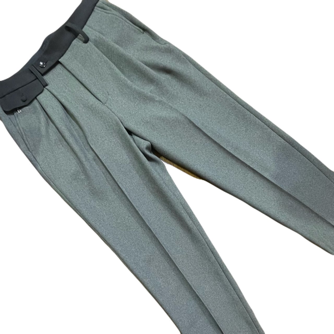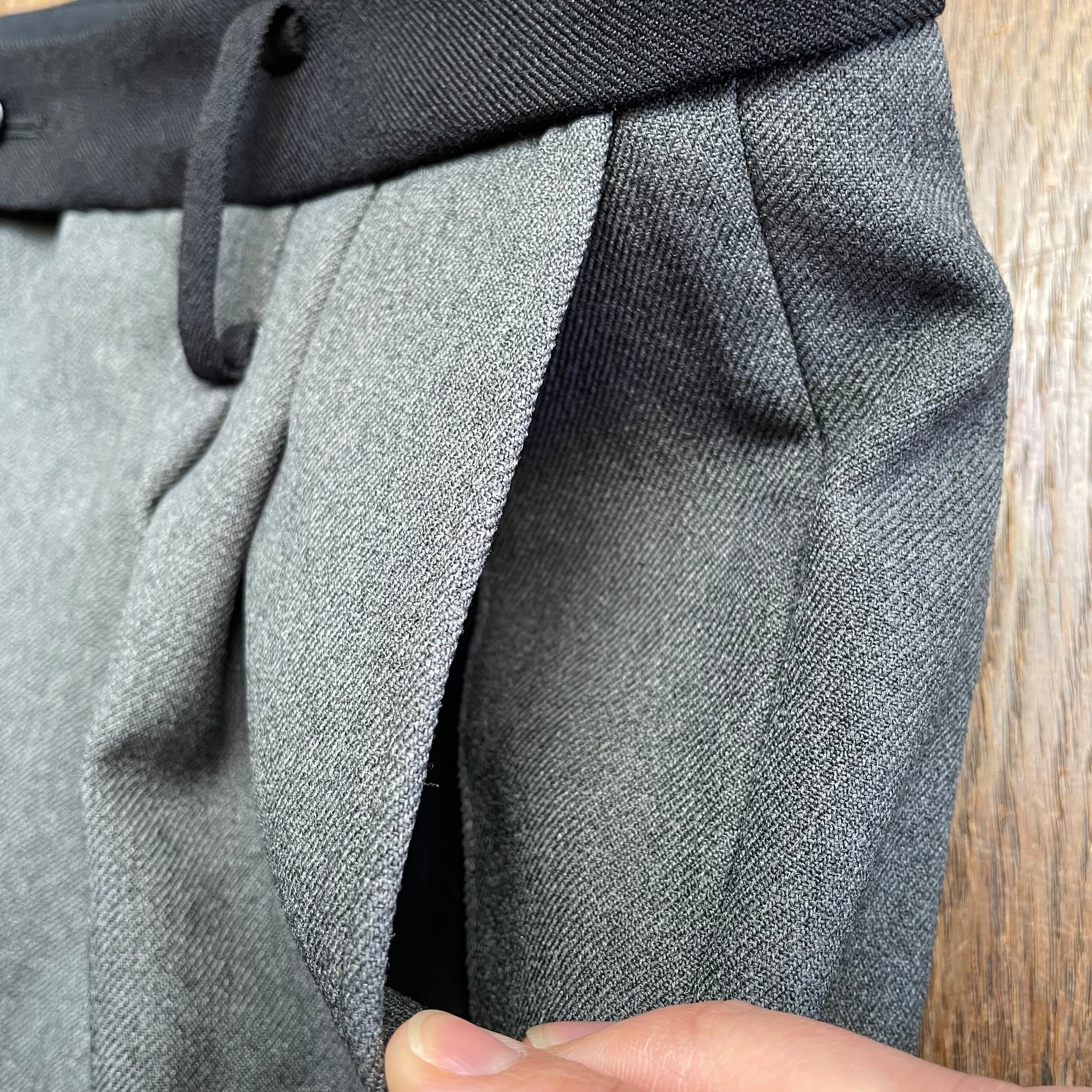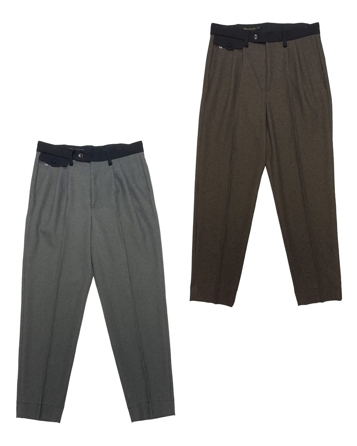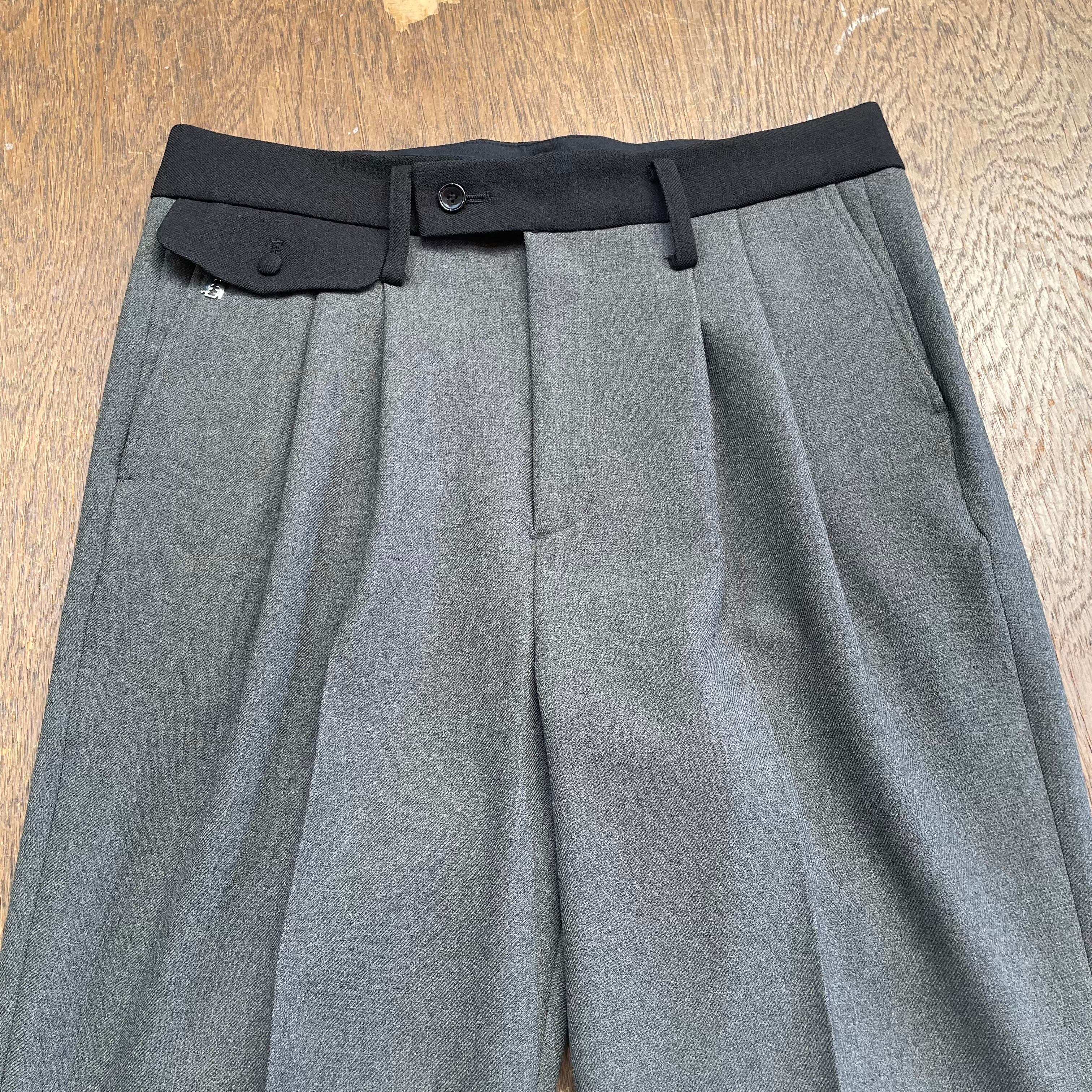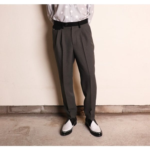 2タックが入った太いワタリから強めの角度でテーパードしていくシルエット。
