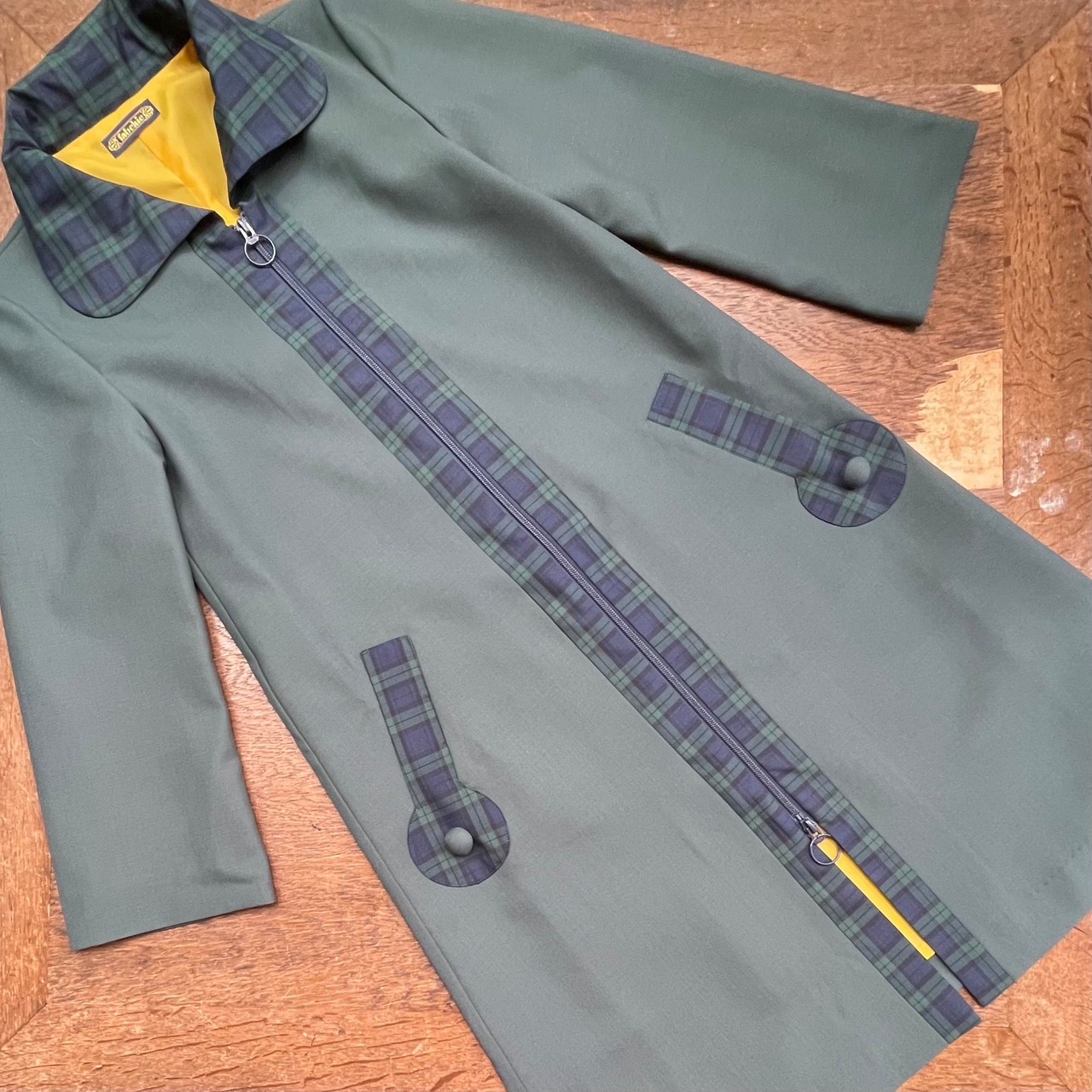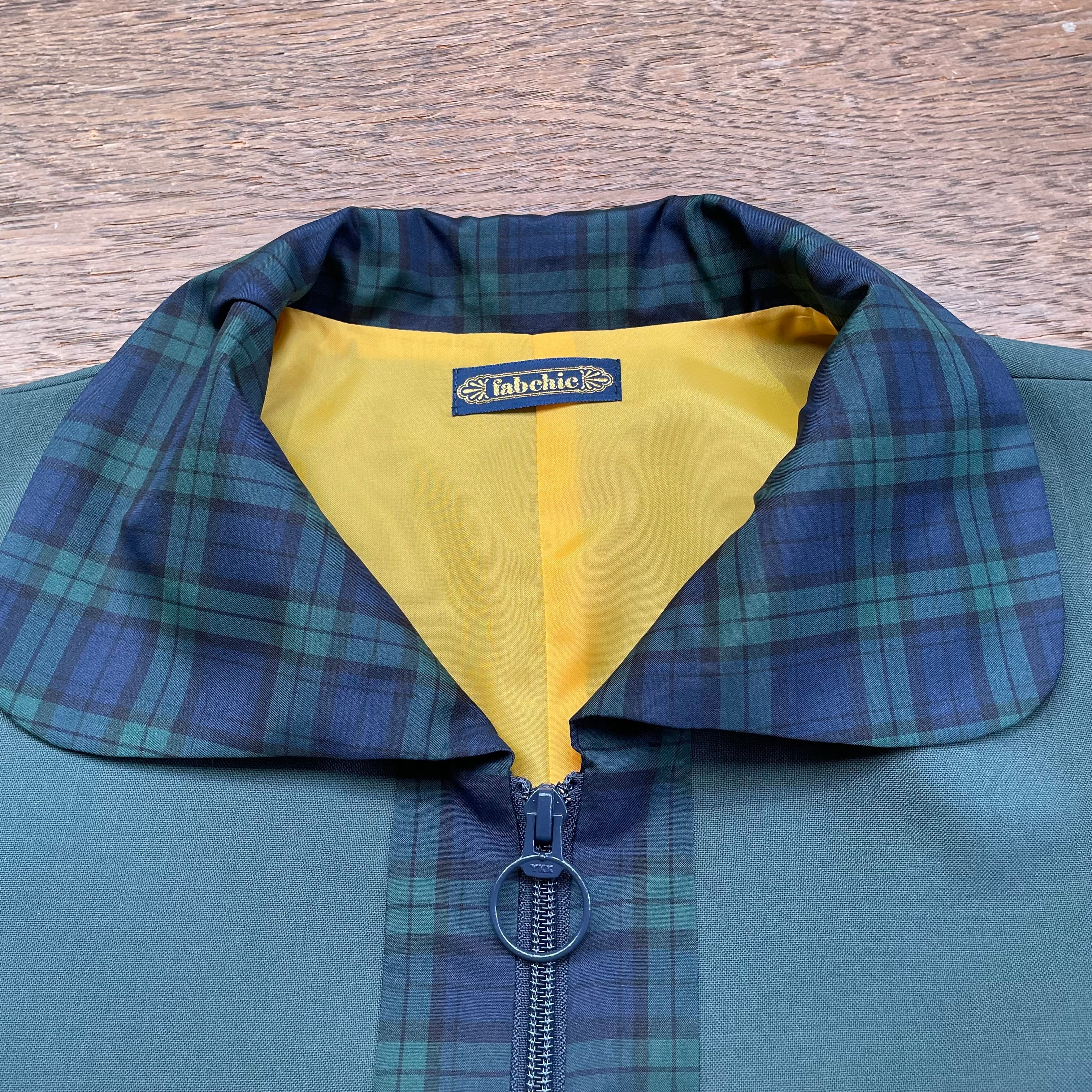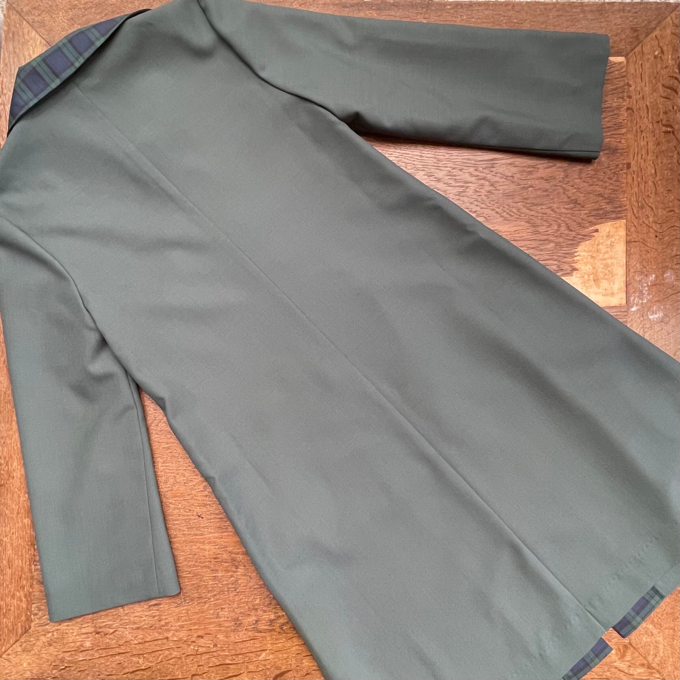 シックな色合いの中で、襟・ポケットのチェック柄の切り替えが絶妙なアクセント。