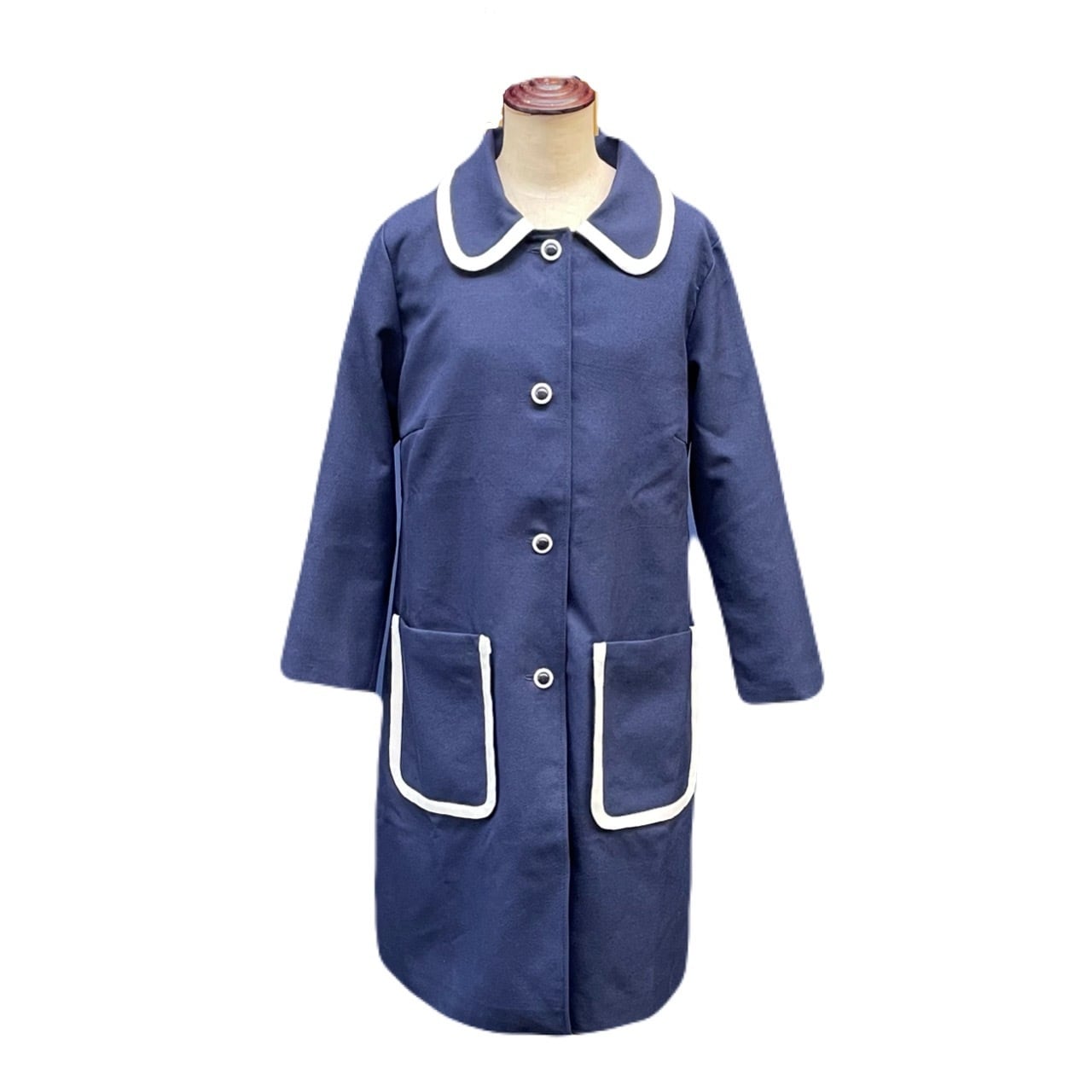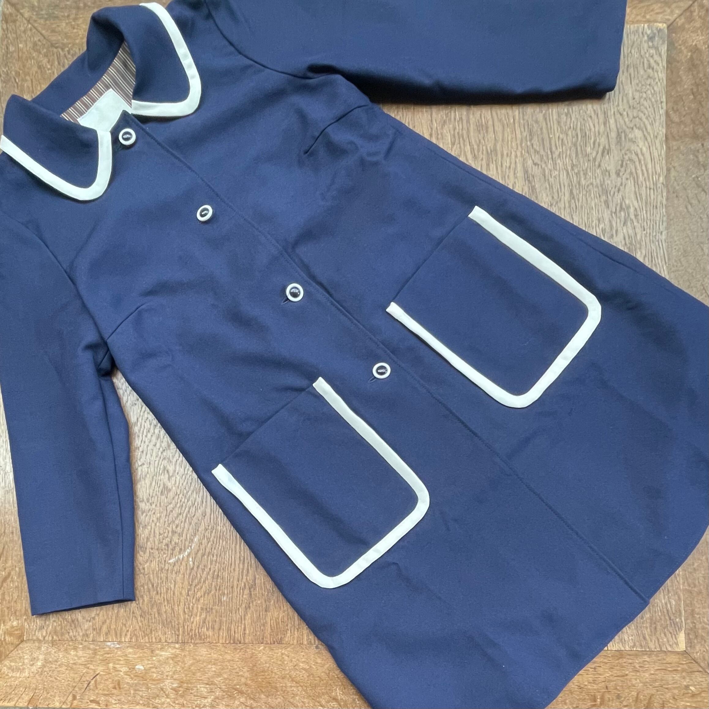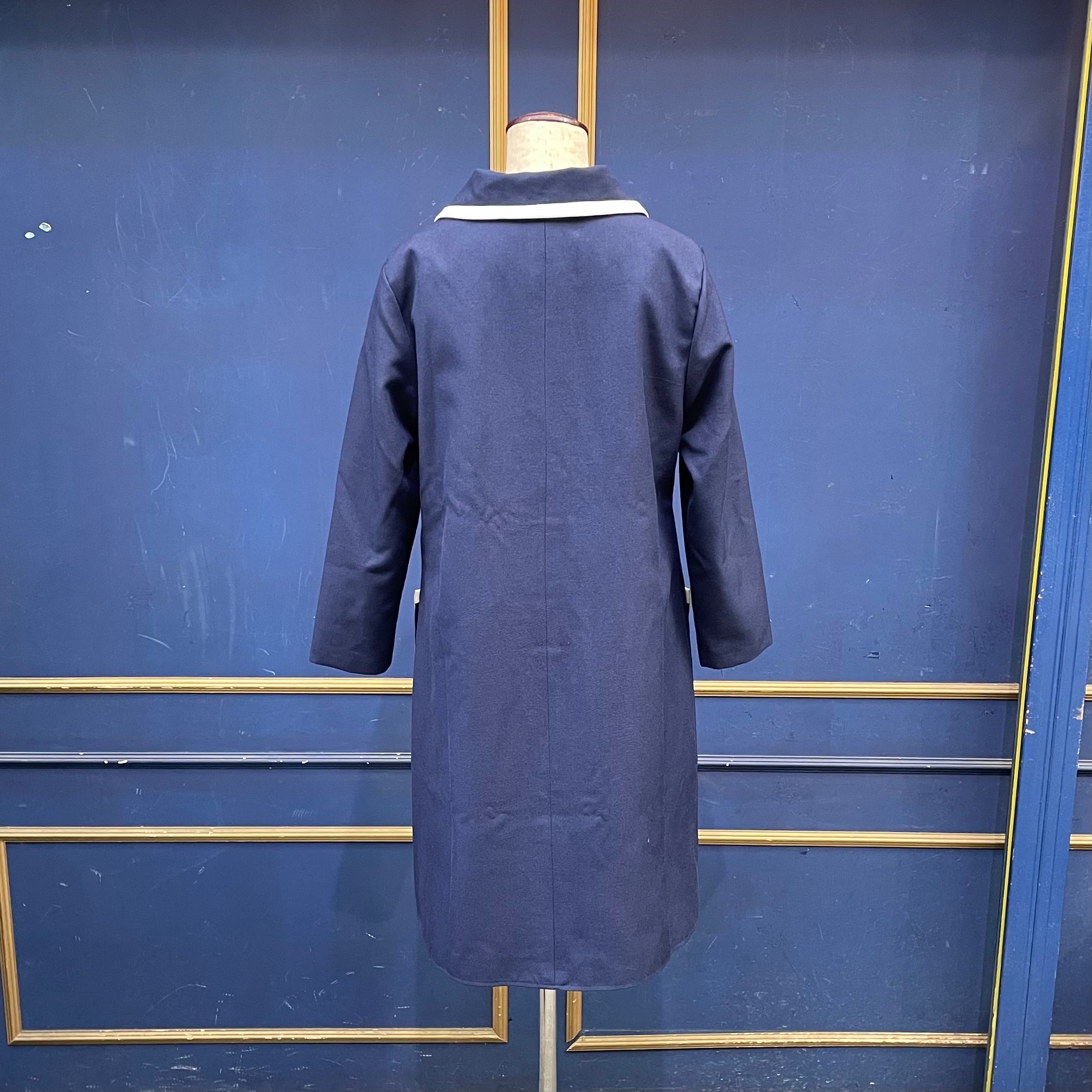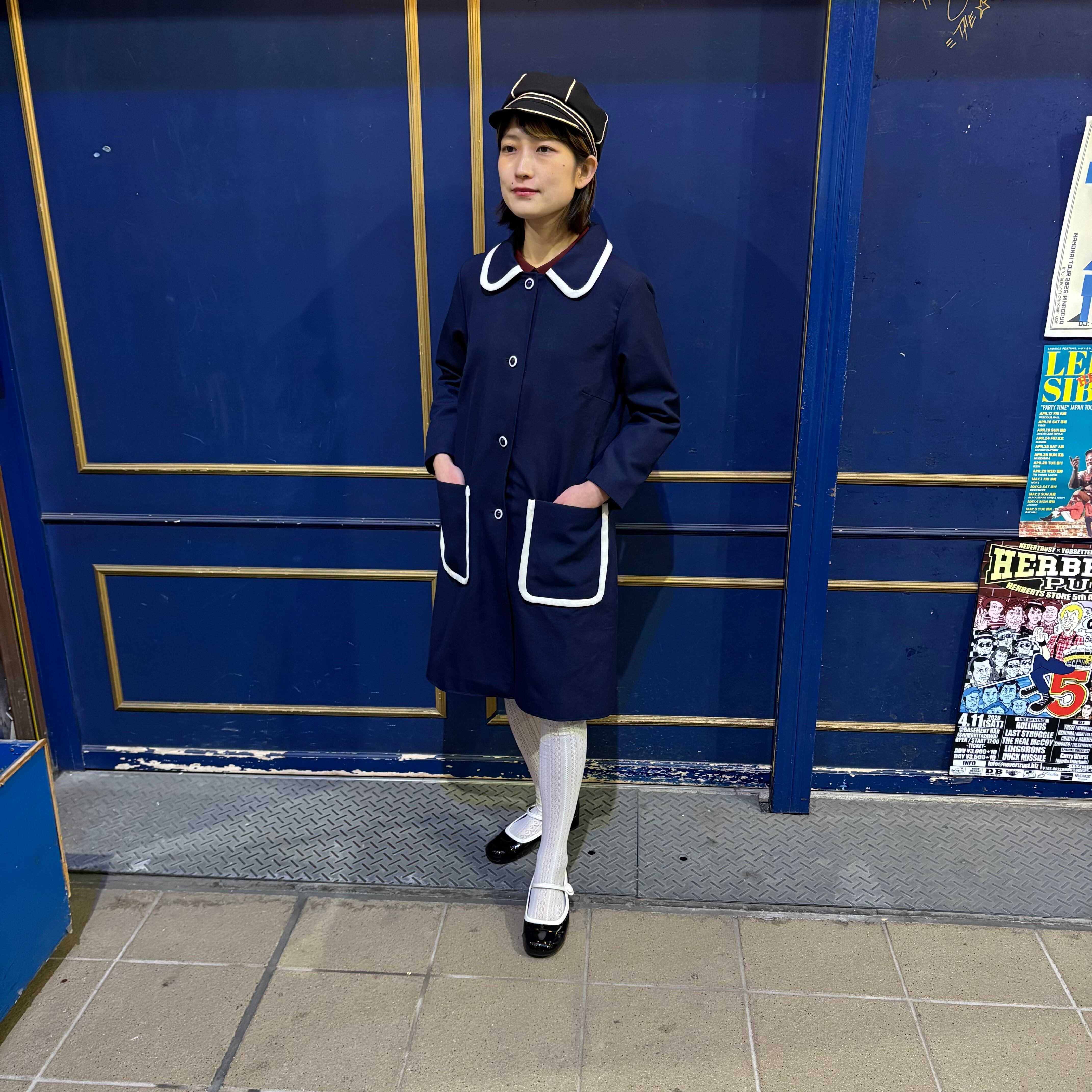 バイカラーのボタンがレトロなコート。