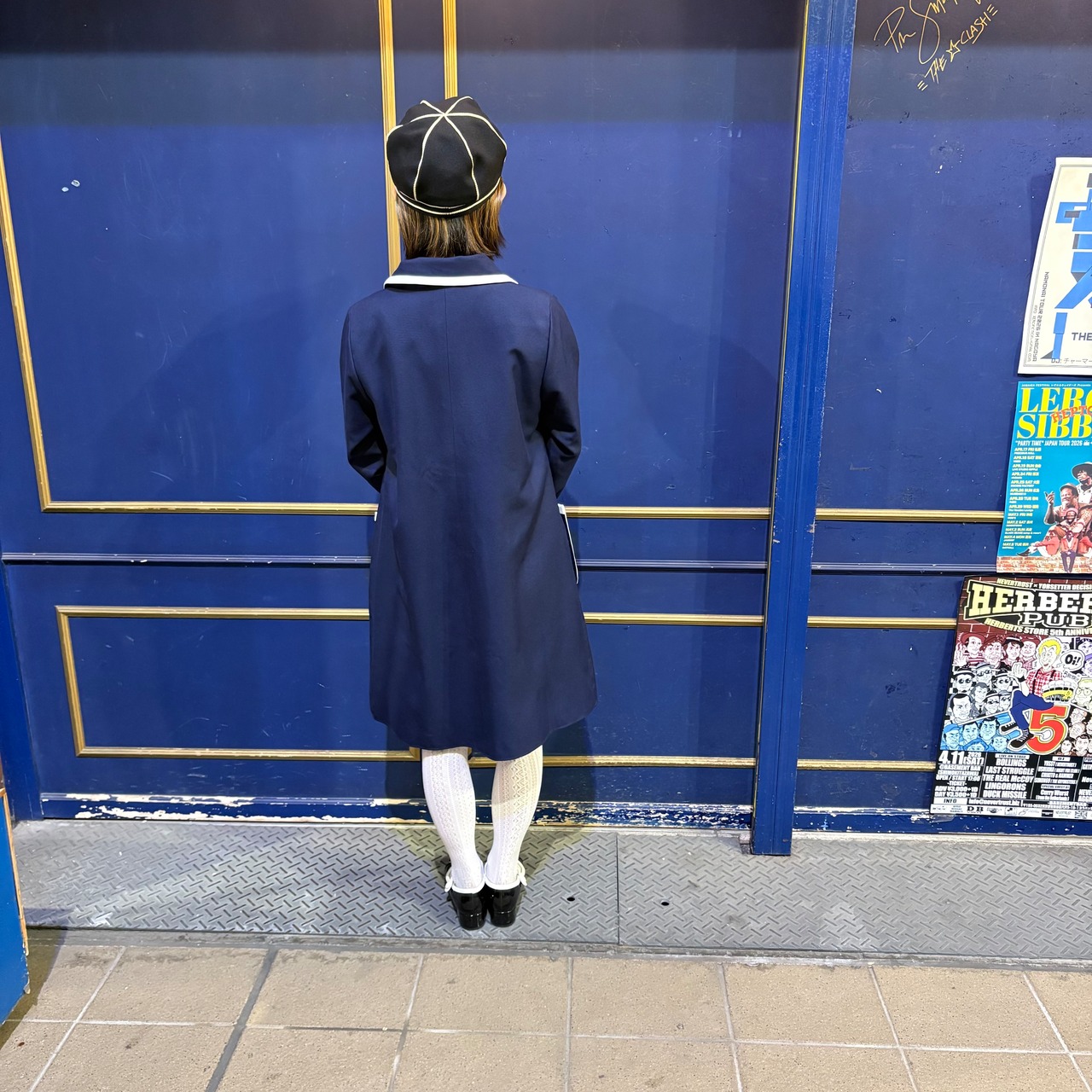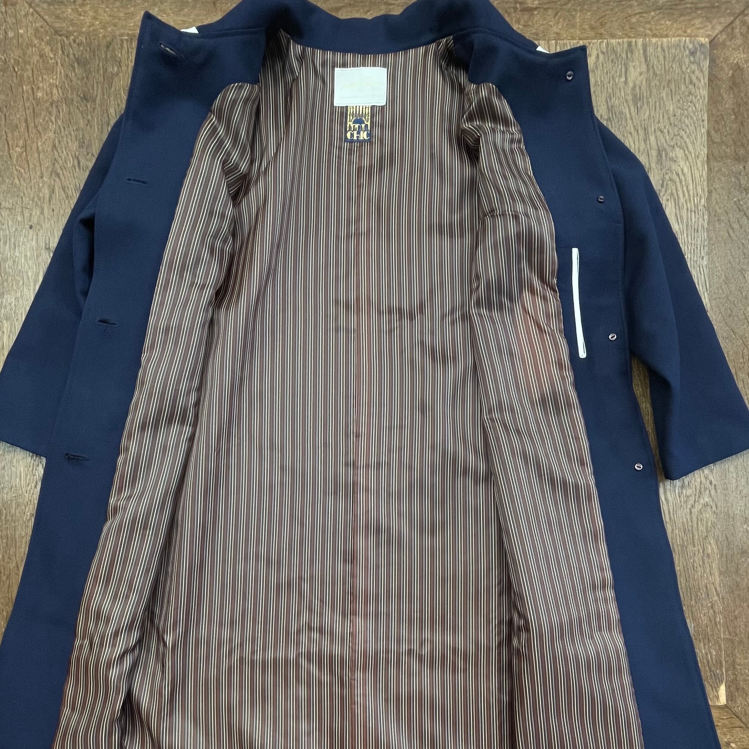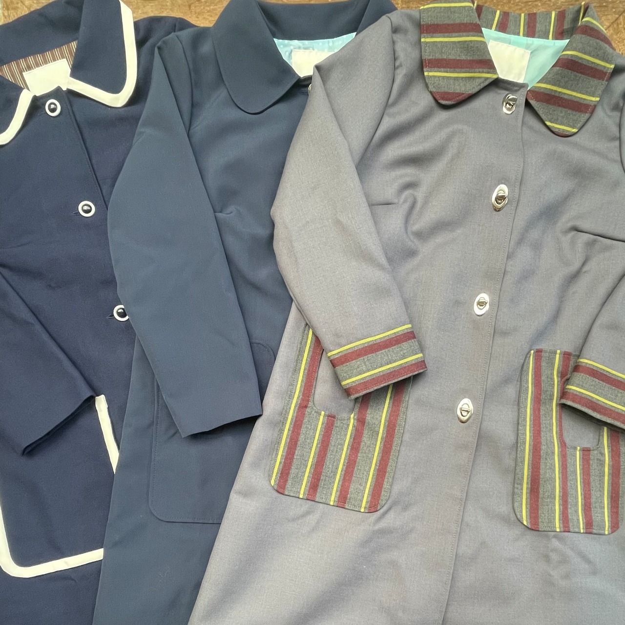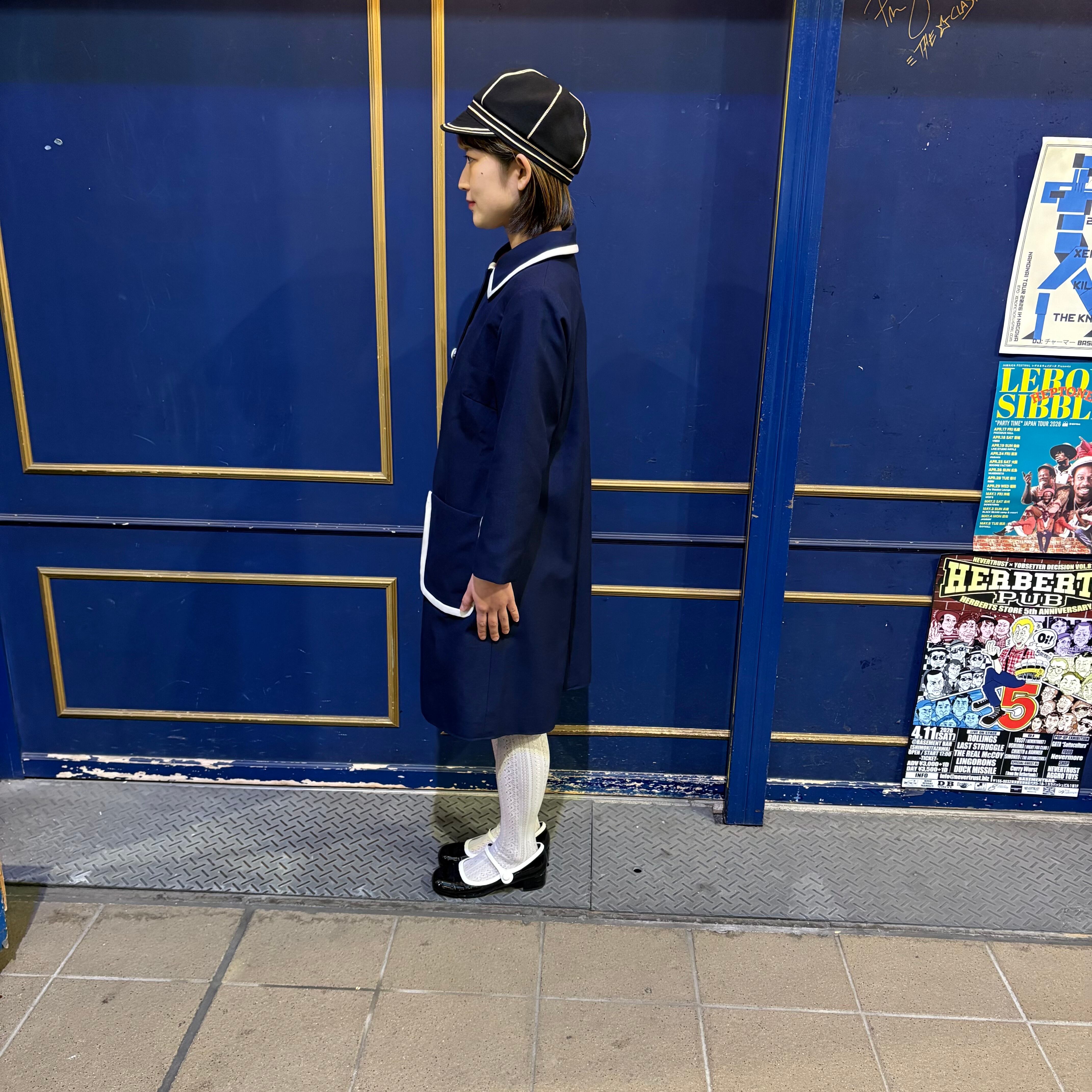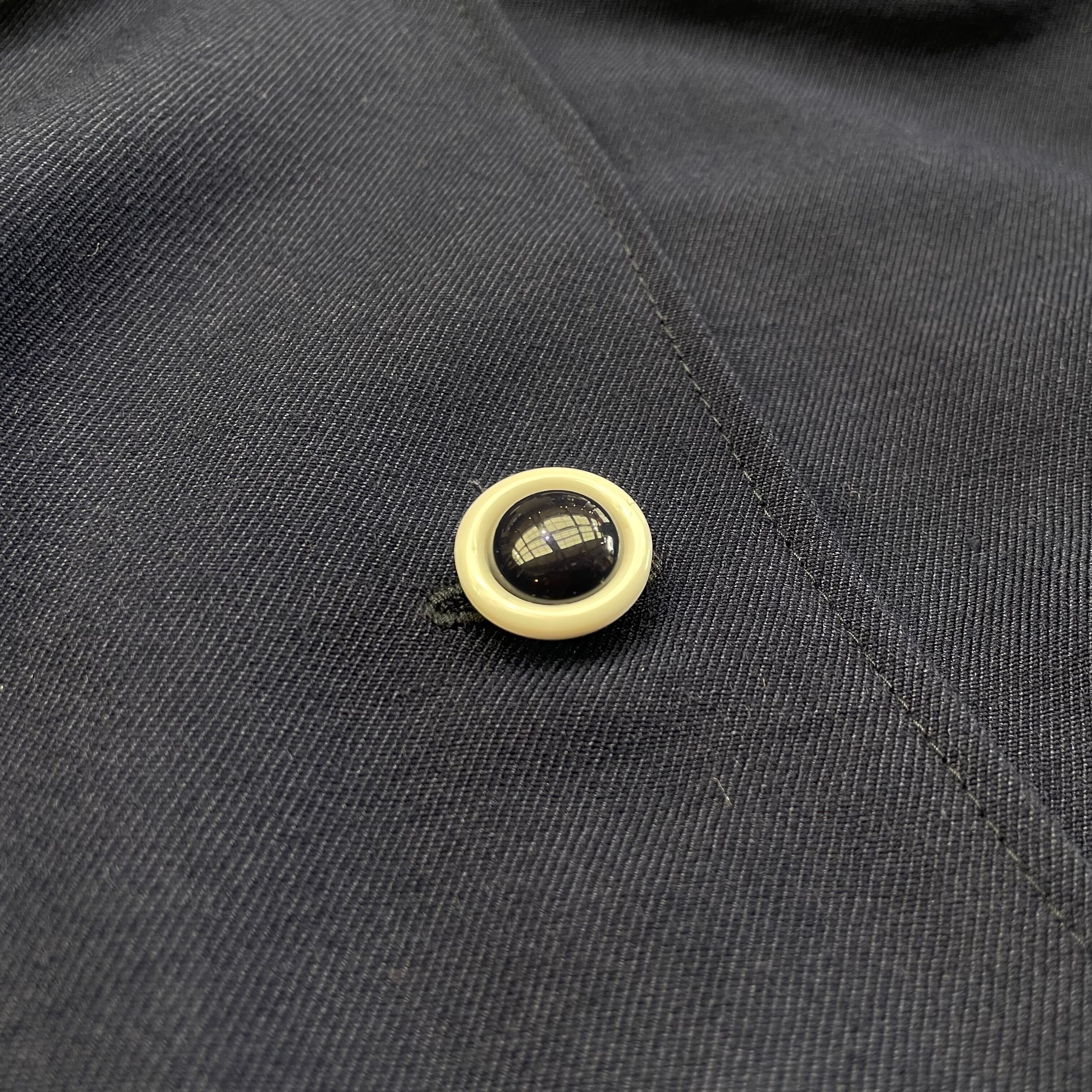 バイカラーのボタンがレトロなコート。