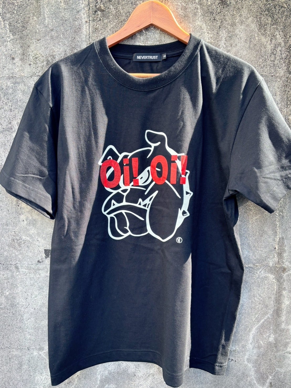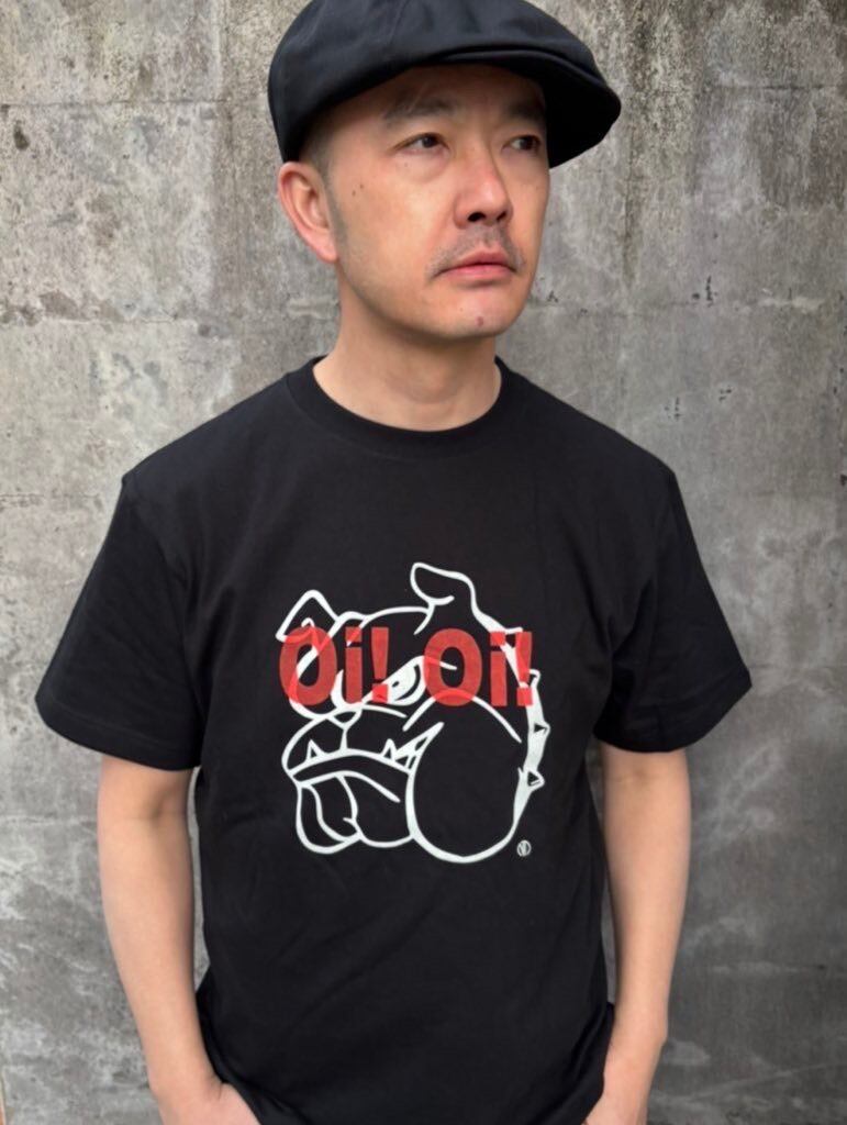 英国感あふれるブルドッグのイラストに、「Oi! Oi!」の文字を重ねた遊び心たっぷりのTシャツ。