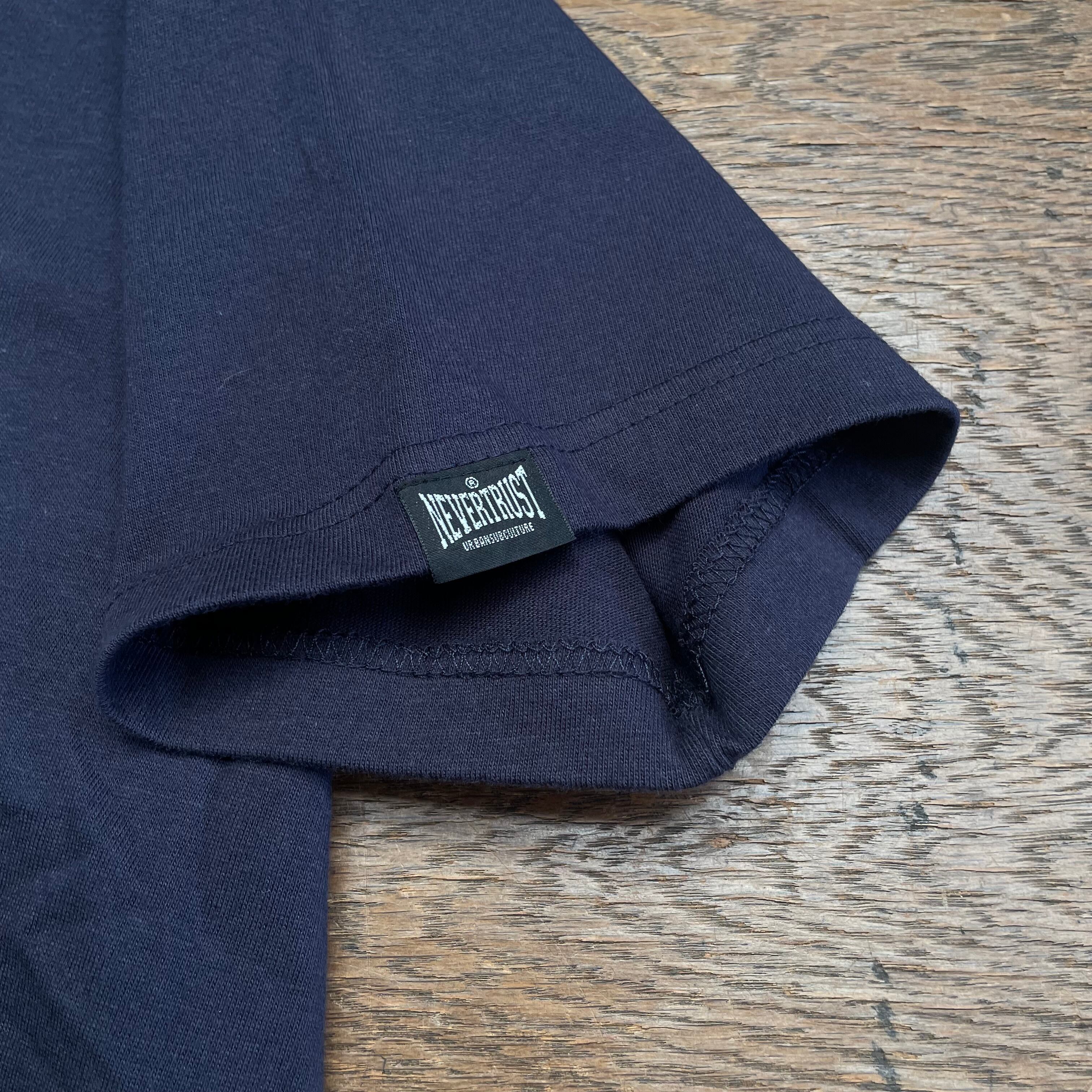 never trust フロッキー・ロゴ Tシャツ NAVY