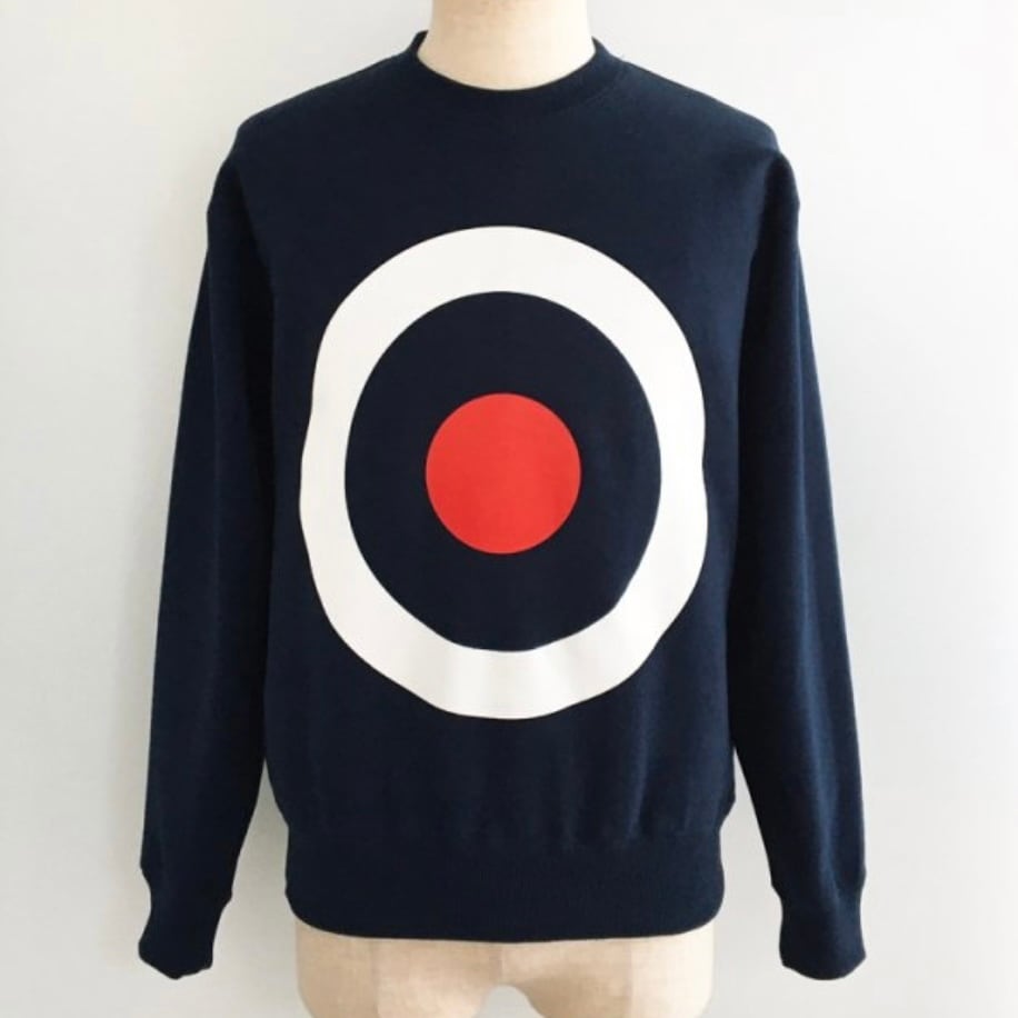 キース・ムーン スタイルのターゲット スウェットシャツにPop Gear的配色のネイビー・バージョンが登場。The Whoのドラマー、キース・ムーンが着用していたことで有名なターゲットマークは、現代ではThe Whoのイメージ的なマークとして、更にはモッズの象徴的なマークとしてよく知られている。