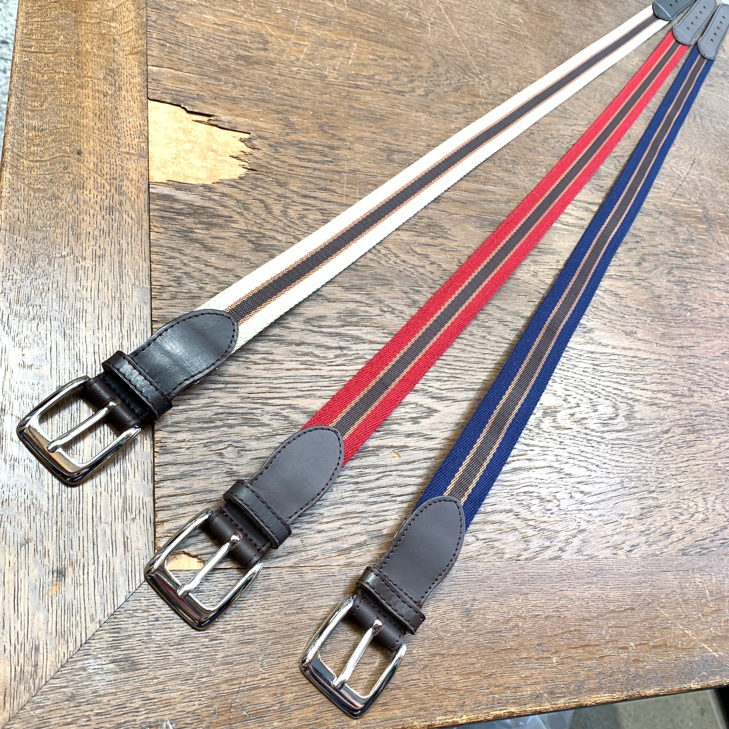 バックル、剣先に牛革を使用した、トラディショナル・ストライプのカジュアルベルト。