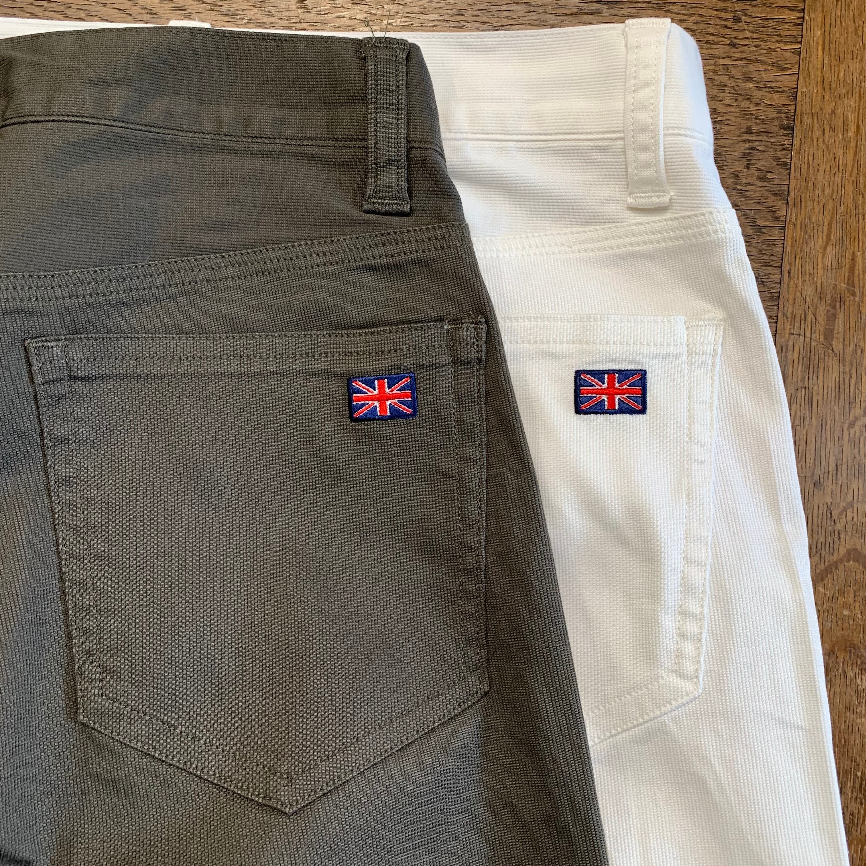 左後ろにDカンのアクセント、右バックポケットにユニオンジャックのワンポイント刺繍入り。