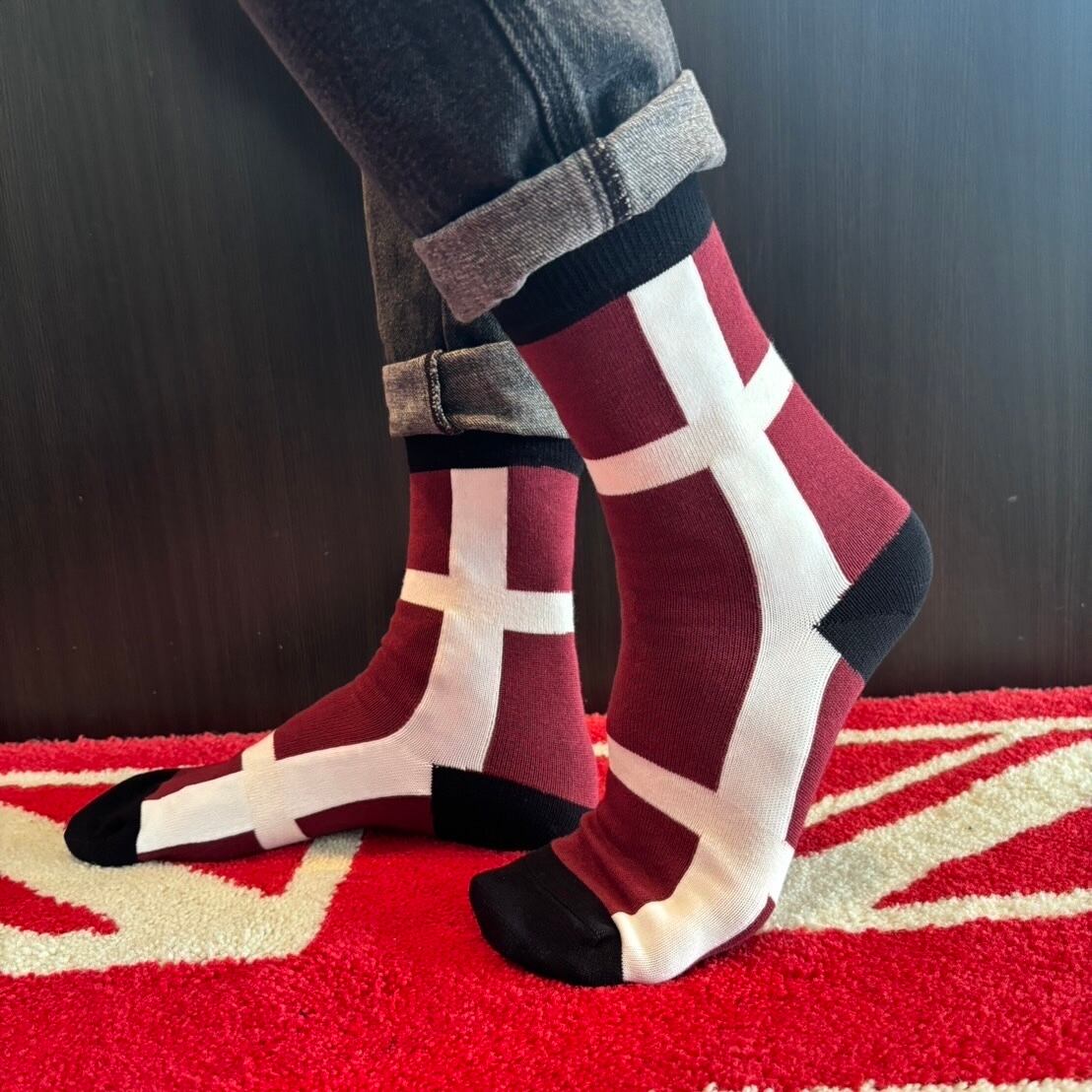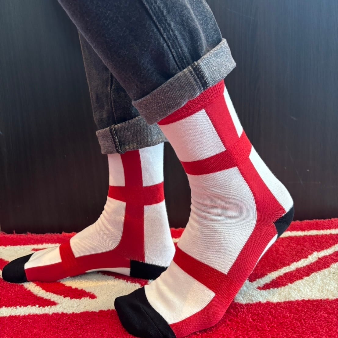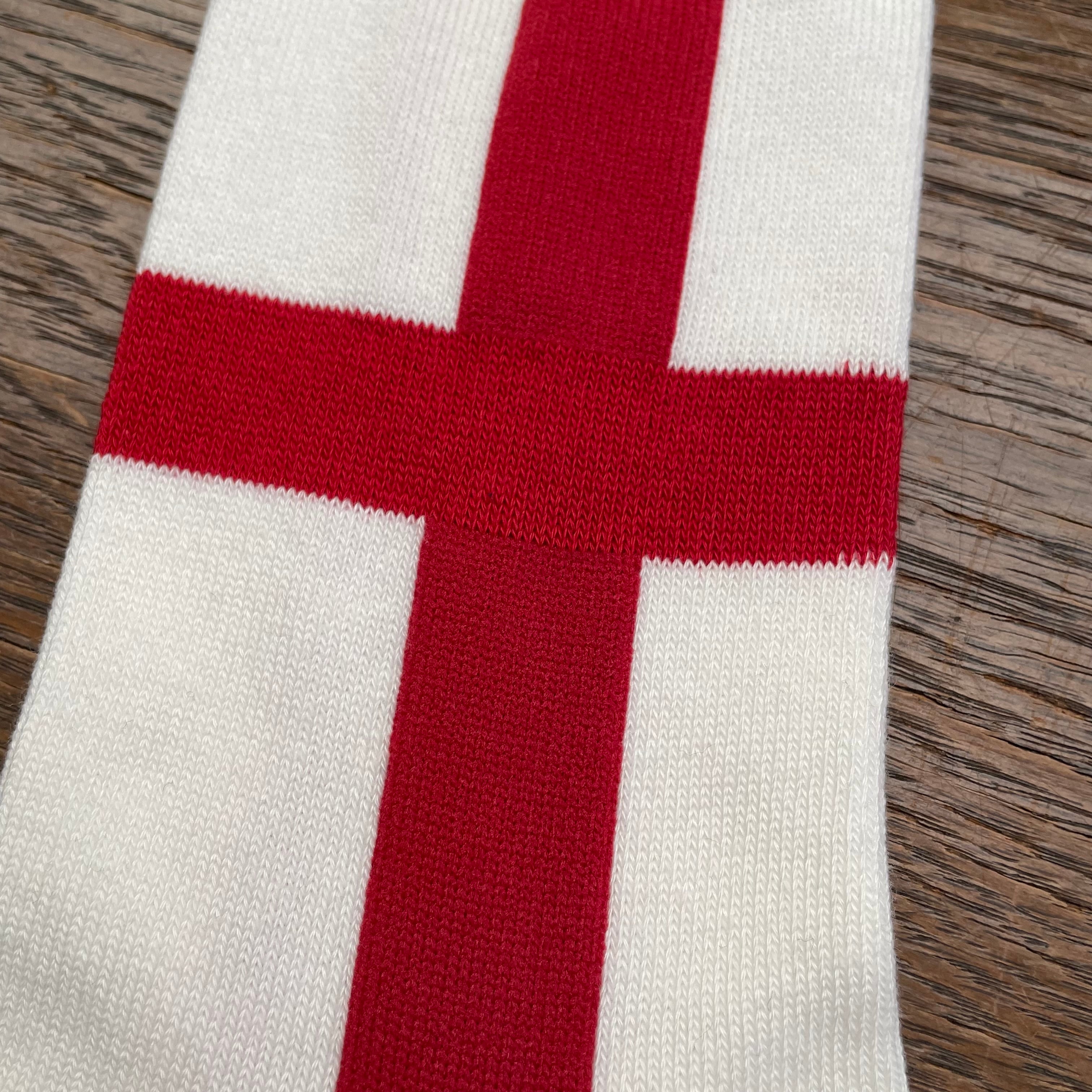 イングランドの国旗に用いられているセント・ジョージズ・クロス(Saint George's Cross)を編み上げた、日本製ジャガード織ソックス。
