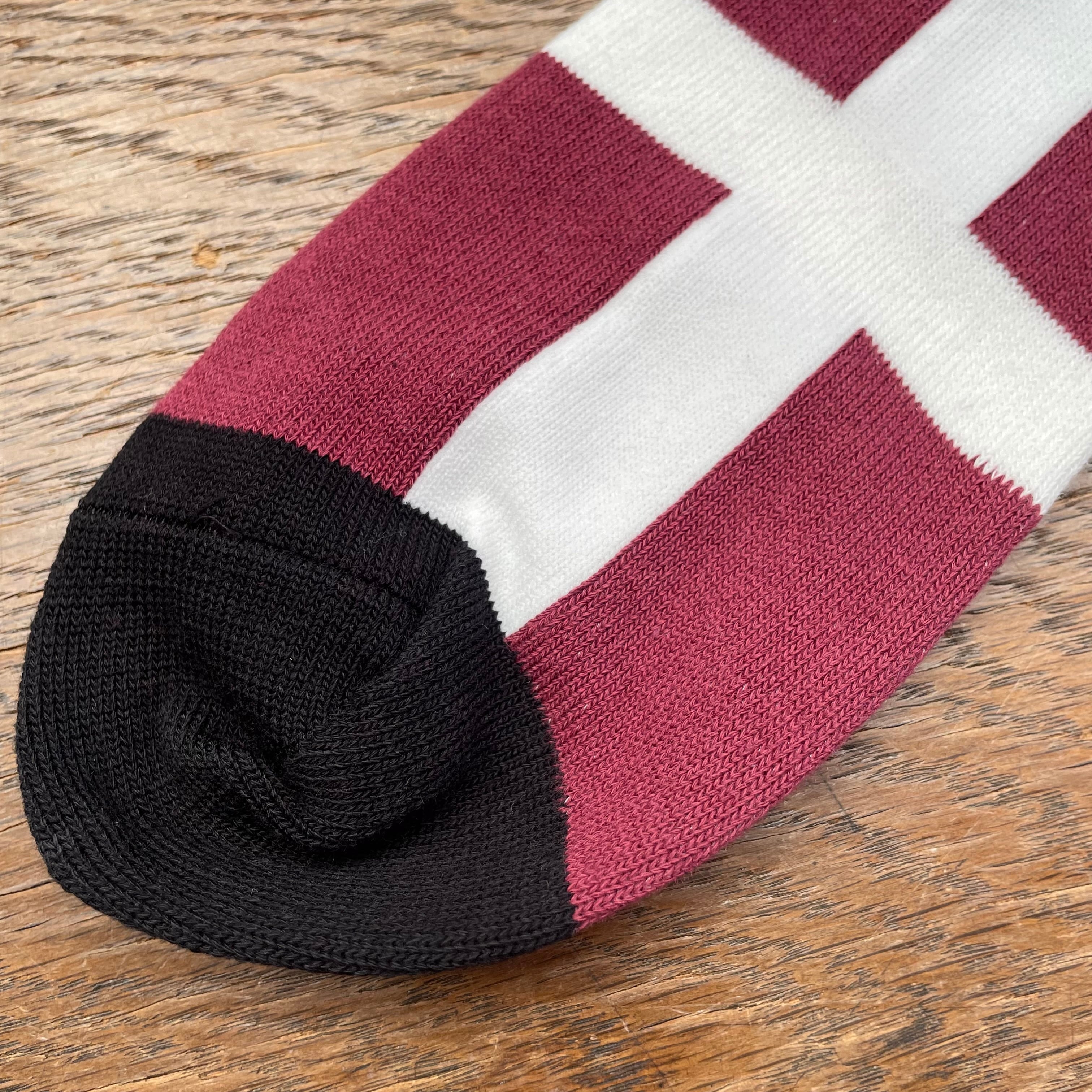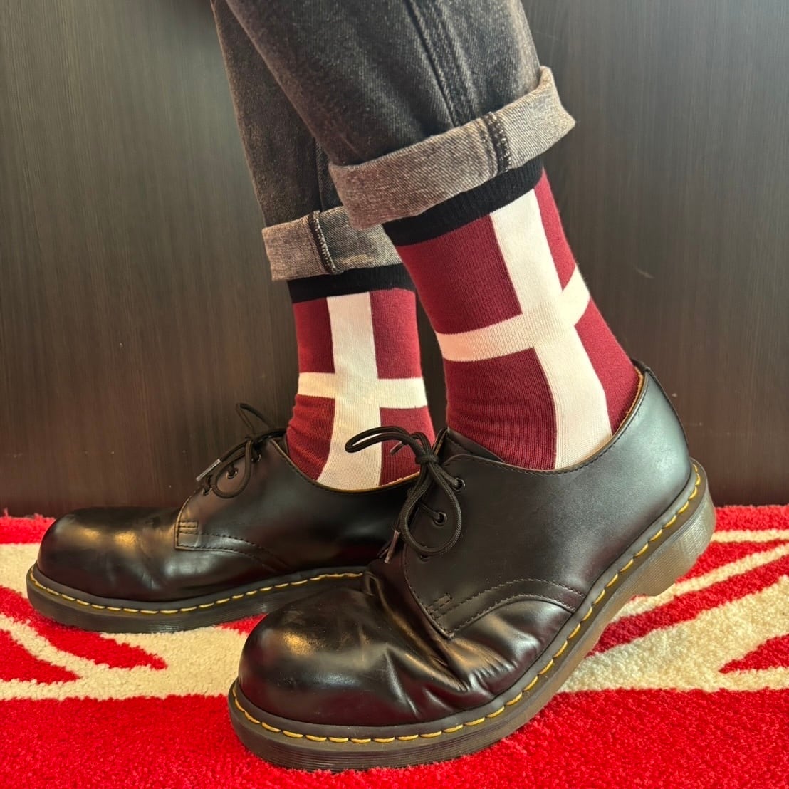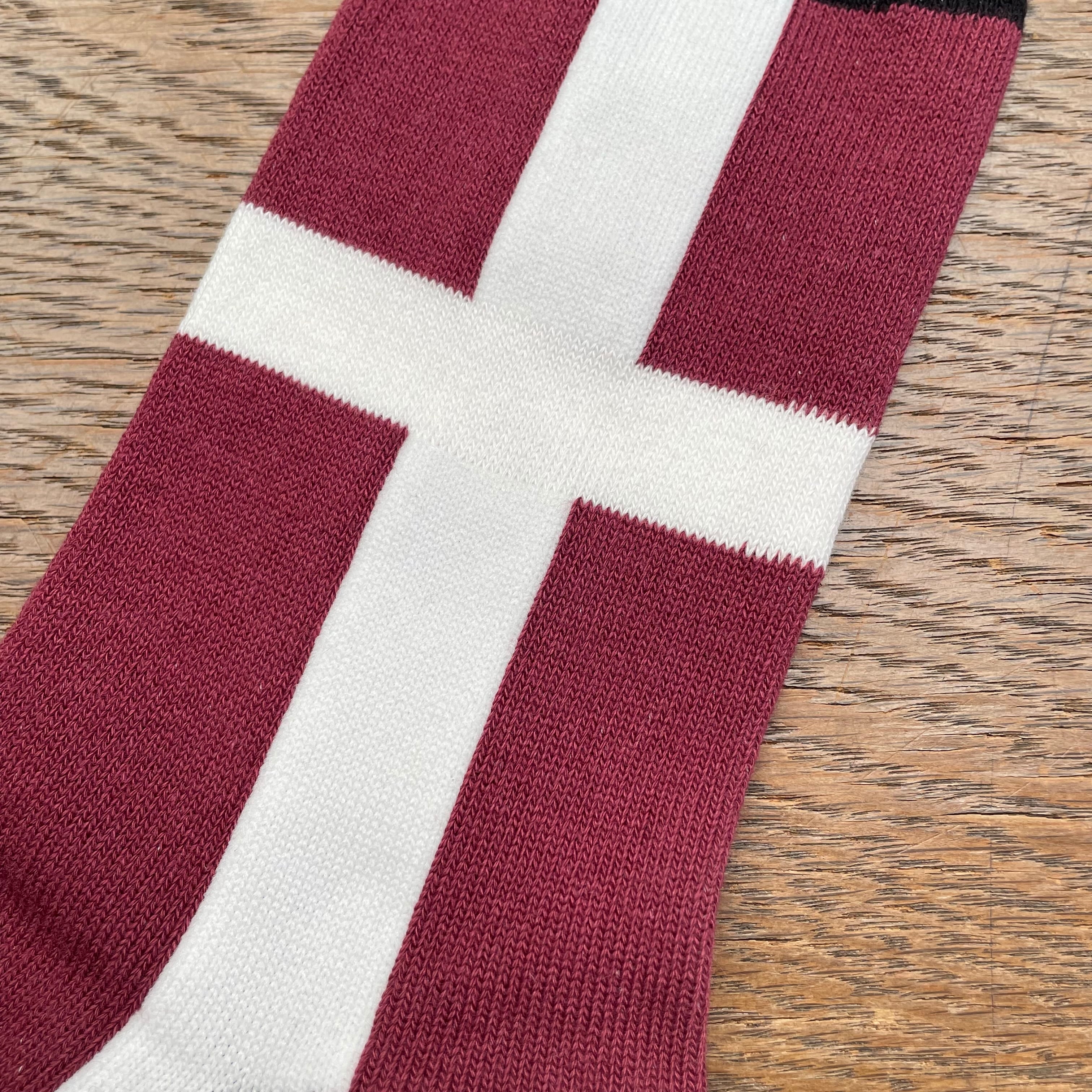 イングランドの国旗に用いられているセント・ジョージズ・クロス(Saint George's Cross)を編み上げた、日本製ジャガード織ソックス。