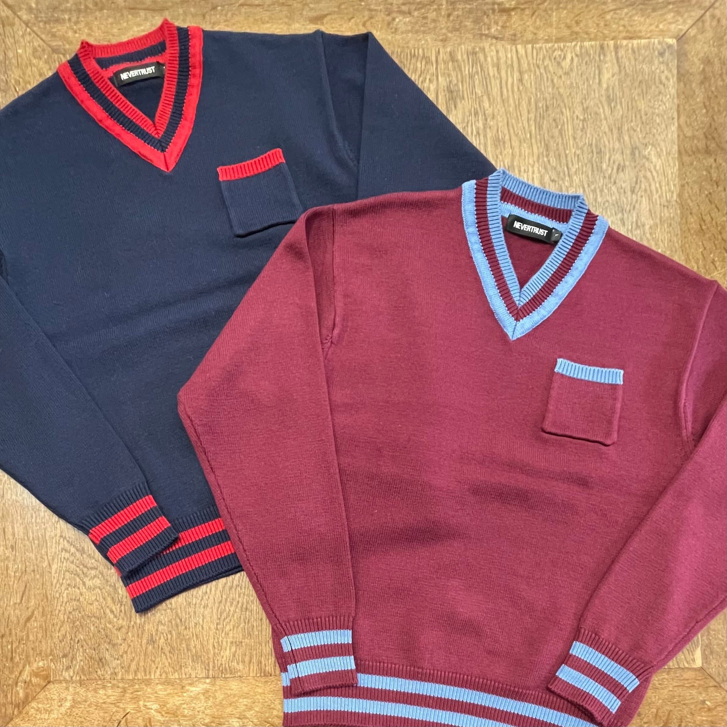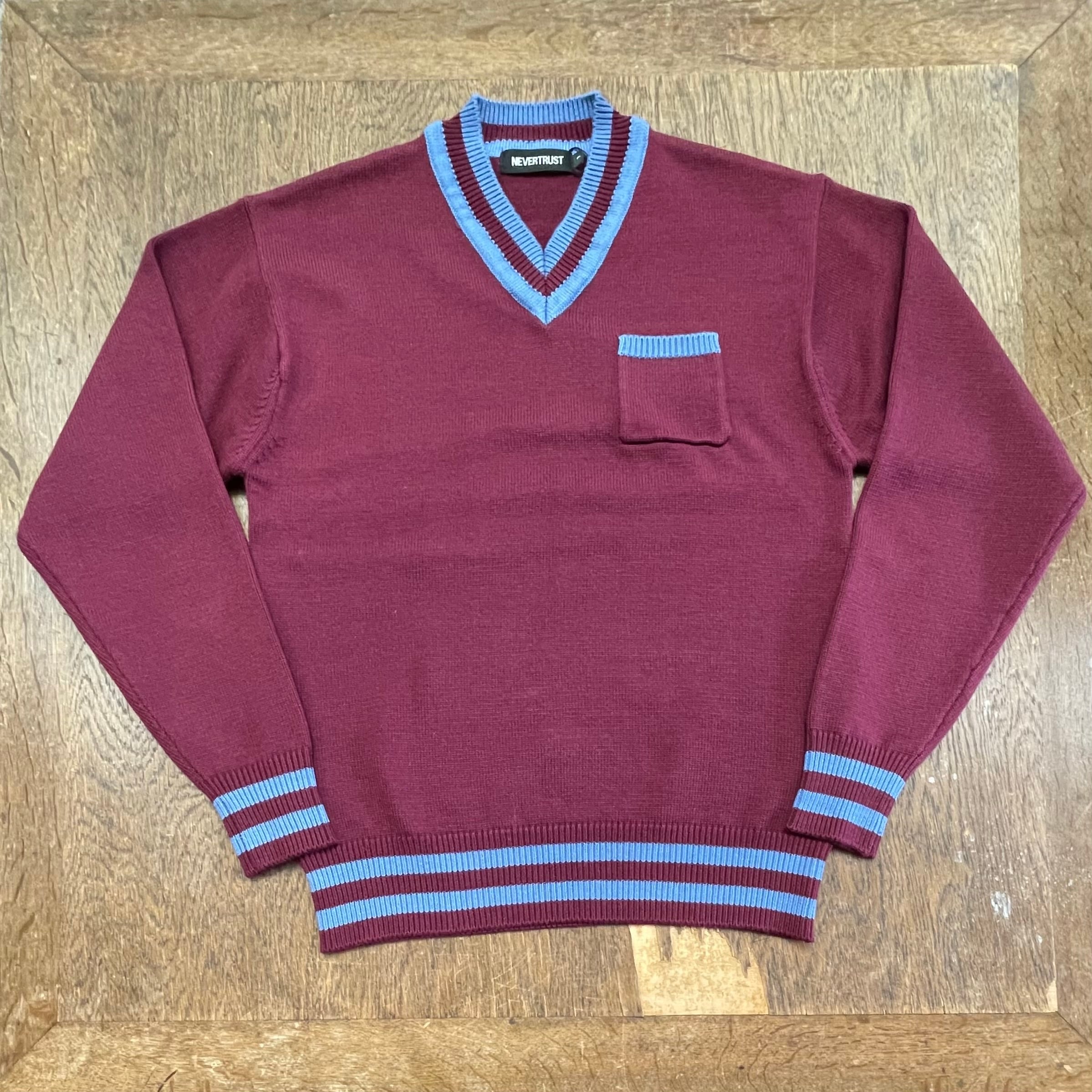 never trust DUNDEE GANGS チルデンVネック・セーター BURGUNDY