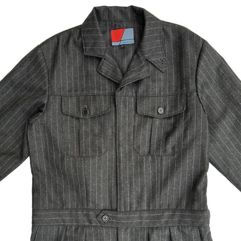 テーラードの襟、両胸に大きなフラップ・ポケット、逆折りの2タックなどトラッドとワークウェアのディティールを取り入れてあり、スーツ感覚でシャツ+ネクタイとのコーディネートも映える紳士のジャンプスーツと言える